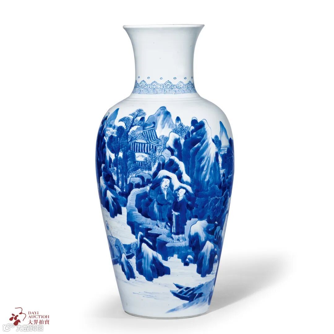 十七世纪,欧洲的葡萄牙和荷兰才开辟商道,正式与远东通商,引得大批东方陶瓷流入,市场一片繁荣景象。明末清初的器物所画题材丰富繁多,令人叹为观止,在西方收藏圈备受追捧。LOT85 清康熙 青花山水人物图棒槌瓶曾展出并出版于2013年举办的《中国官窑瓷器及工艺品》中。