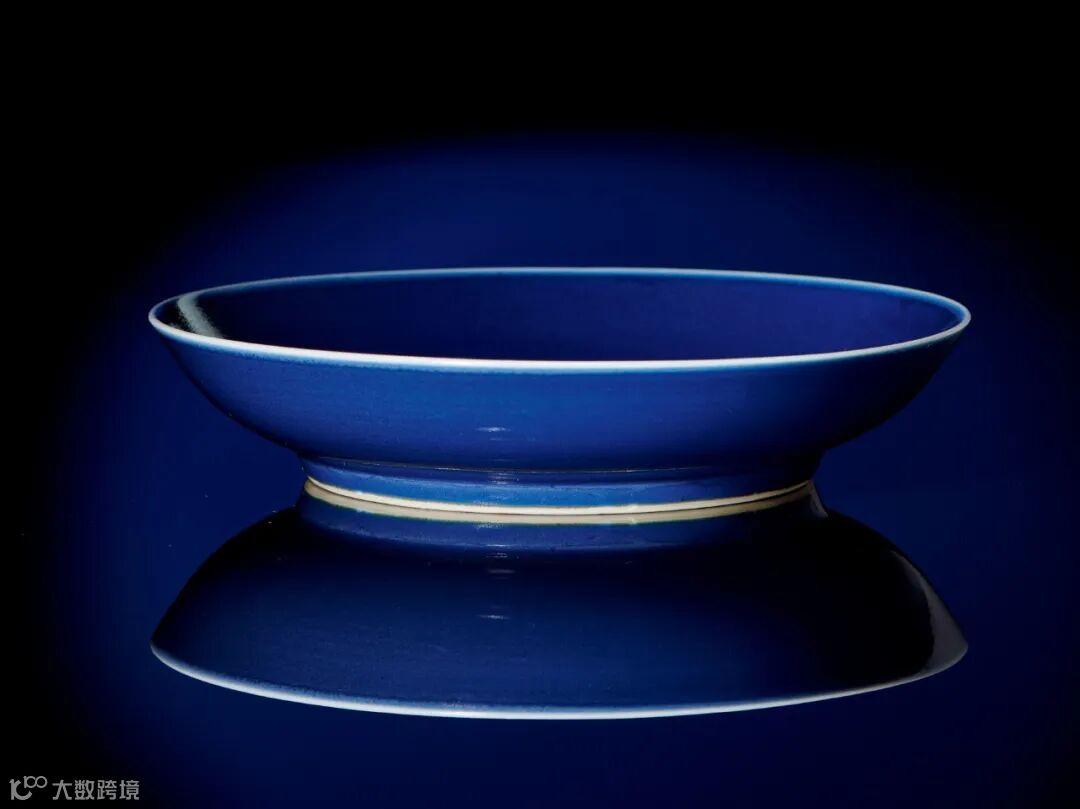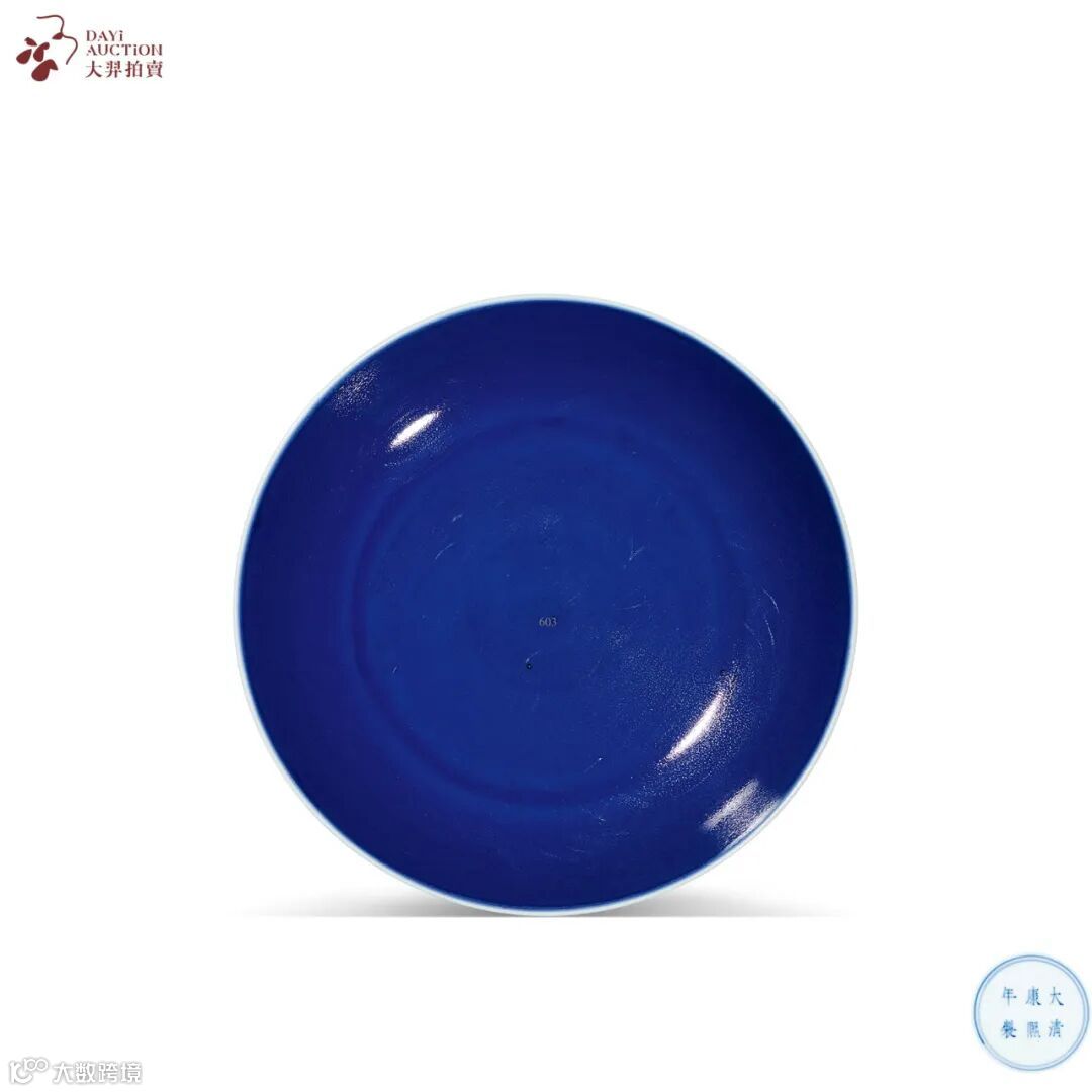 此件清康熙 霁蓝釉盘,通体施霁蓝釉,釉质肥腴,色泽深沉凝重,光亮细腻,釉面橘皮棕眼密布,尤如蓝宝石般璀璨深耀,口沿一线灯草口,为整器平添几分宁谧之趣,具有鲜明的时代特征。