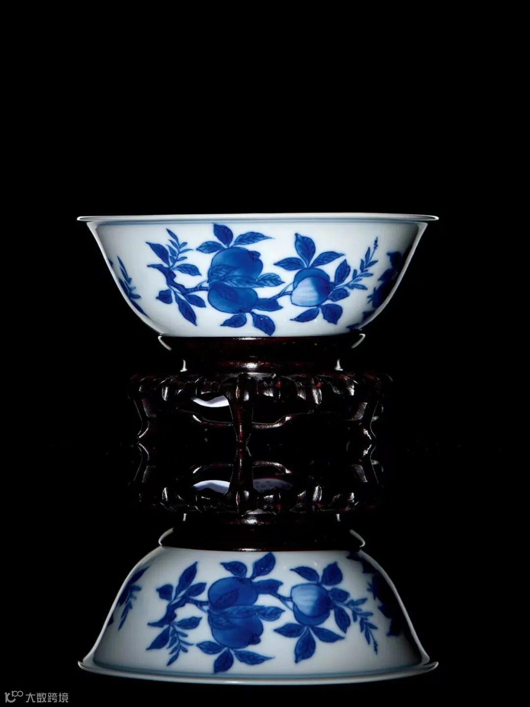 腹部一圈釉下模印缠枝牡丹纹一周枝叶舒展匀称,线条流畅,碗内白地匀净,中心粉彩绘一折枝蟠桃,画工精细,施色层层递进,甚为逼真,绿叶浓淡有致,青翠欲滴,更显瑞桃娇嫩妍丽。
