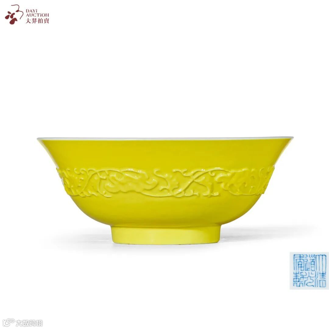 另还有LOT634 清道光 内粉彩外柠檬黄釉模印缠枝花卉纹大碗外壁满施柠檬黄釉,釉面柔润丰腴,隐现波浪纹,呈色明快鲜亮,娇美夺目。柠檬黄釉在新进欧洲珐琅彩的启发下得以创烧,其质量至雍正朝达到巅峰,成为清宫御瓷的主要釉色之一。