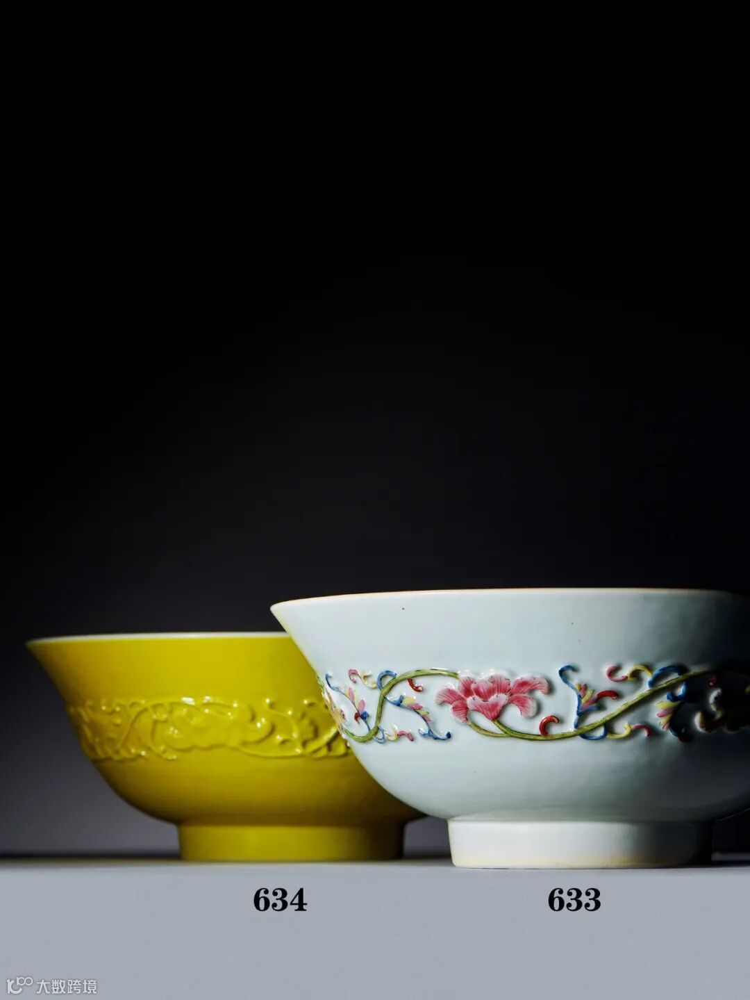 与本场另一件LOT633 清道光 粉彩模印缠枝花卉纹碗纹饰相似,展现着道光朝的极富立体感和艺术创造魅力。将单色釉与同为清宫创烧的粉彩瓷装饰手法两相结合,碰撞出新颖的视觉效果,堪称象征清宫御窑卓越制瓷工艺的范例。
