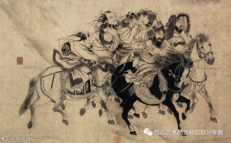 随着契丹和党项族的崛起,广袤的欧亚土地多半皆为游牧民族所统治,西域与中原地区扁壶风格渐渐融合,由于壶身腹部平面更贴合于人的后背,且方便悬挂于骆驼或马的鞍座之上,“马挂壶”的生产在这一时期达到顶峰。现藏于日本大阪市立美术馆:南宋画家宫素然所作《明妃出赛图》,可清晰的看出其使用情况。