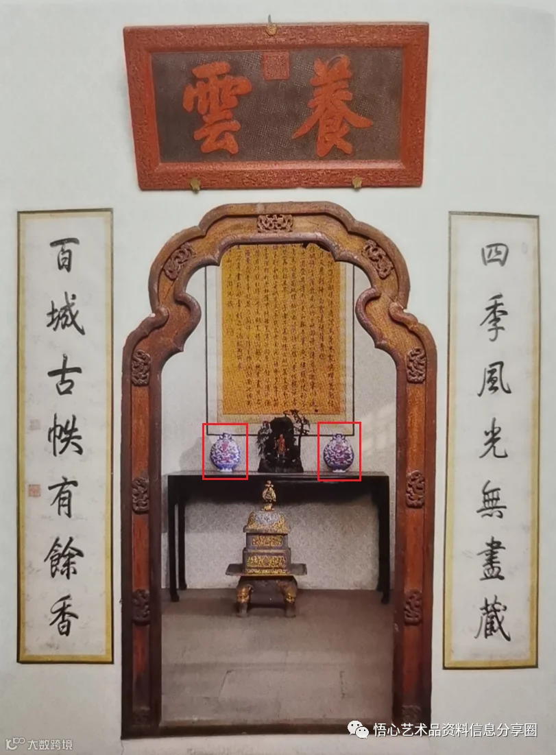 同治十三年《倚虹堂陳設檔》中有拍品同类器的陈设记录,重华宫后院正殿翠云馆中亦有一对青花釉里红龙纹抱月瓶陈设其中。重华宫为乾隆做宝亲王时期曾经住过的一处宫殿,在他心中一直认为重华宫为肇祥之地,并在晚年将其变成了一个小的博物馆,摆放着他未登基时用过的各种生活物品,以及祖父、父亲两代老皇帝赏赐的各种贵重的纪念品。