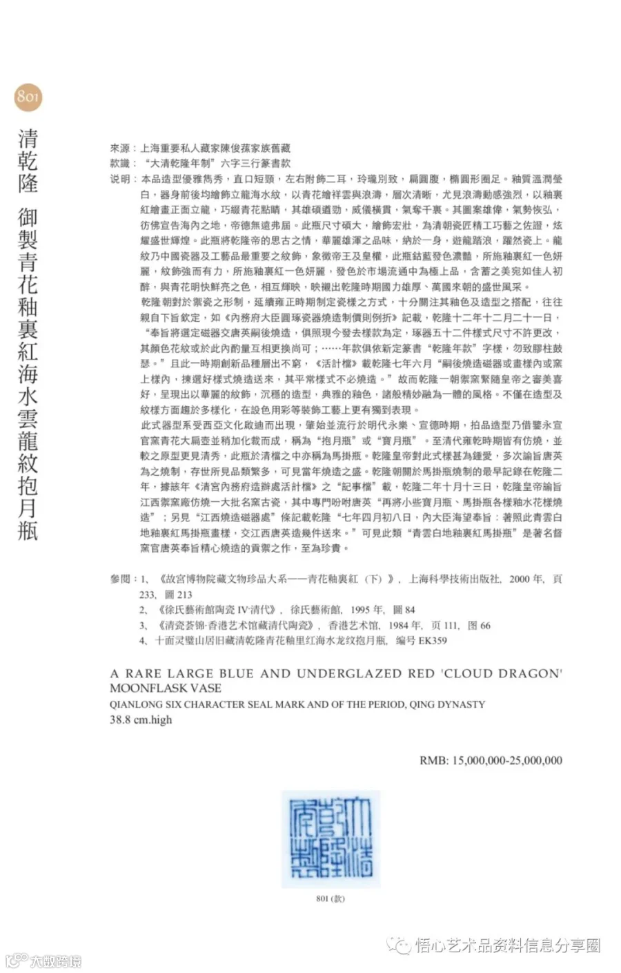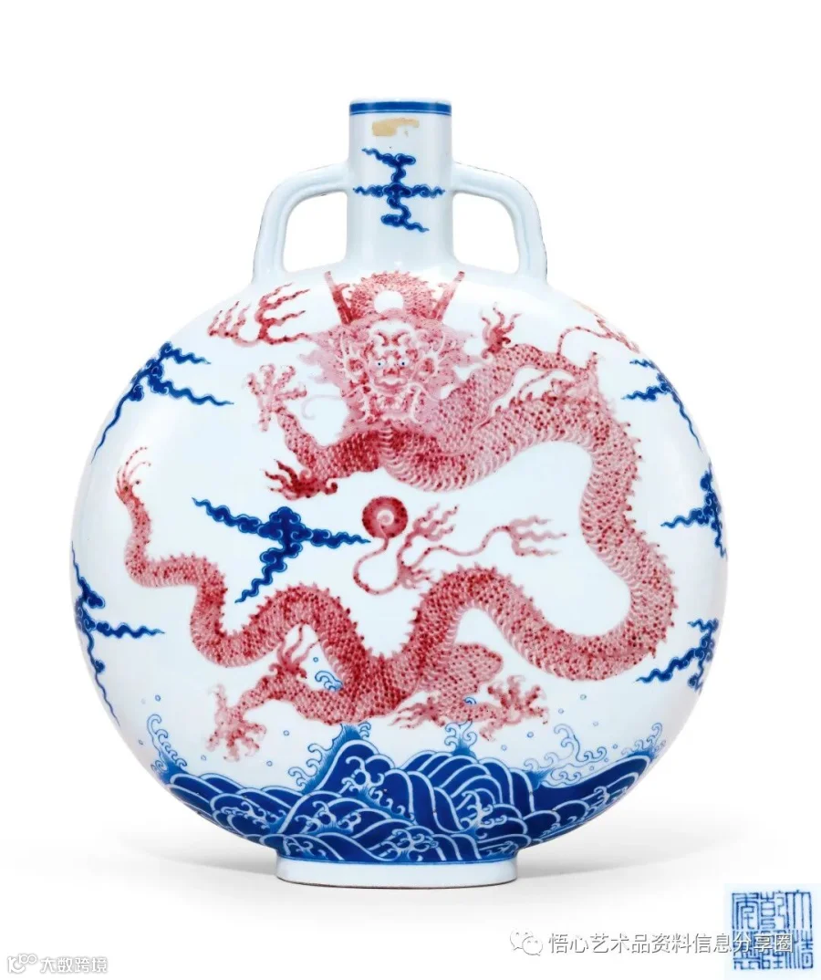 拍品之青花釉里红龙纹抱月瓶最早的烧造记录是:“乾隆七年四月初八日,内大臣海望奉㫖:着照此青雲白地釉裡紅龍馬褂瓶画樣交江西唐英,照樣燒造幾件送來,欽此。”