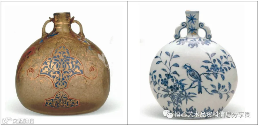 大英博物馆藏:1300-1500年间,叙利亚彩绘玻璃扁壶(左)