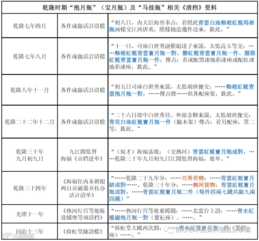 乾隆三十年九江関監督海福《贡档进单》中亦有相关呈贡记录,并注明“交热河”。恰巧在光绪十一年《热河行宫等处陈设铺垫等项清档》中可查到在乾隆三十年九江关烧造的“青雲紅龍寶月瓶成對”即安放在“热河行宫東暖閣北窗台上”。