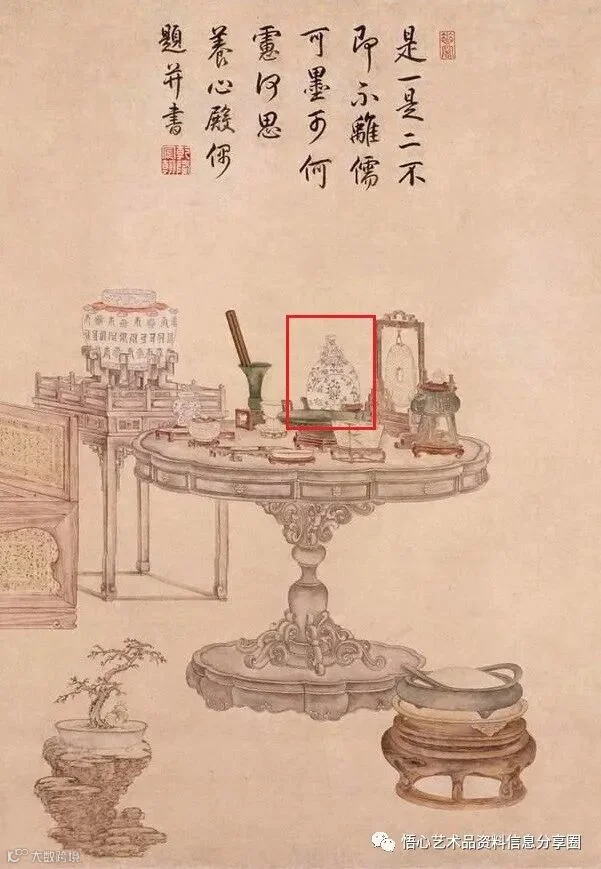 至乾隆一朝,抱月瓶持续烧造,纵览各大博物馆馆藏作品可以看出,乾隆时期抱月瓶尺寸增加,底足增高,纹饰大气磅礴,从内到外尽显皇家气派。而高宗也对抱月瓶甚是钟情,在故宫博物院清宫旧藏一张宫廷绘画《弘历是一是二图》中,乾隆帝身着汉人服饰,正在坐塌上观赏皇家收藏珍宝,其中就有抱月瓶的身影。