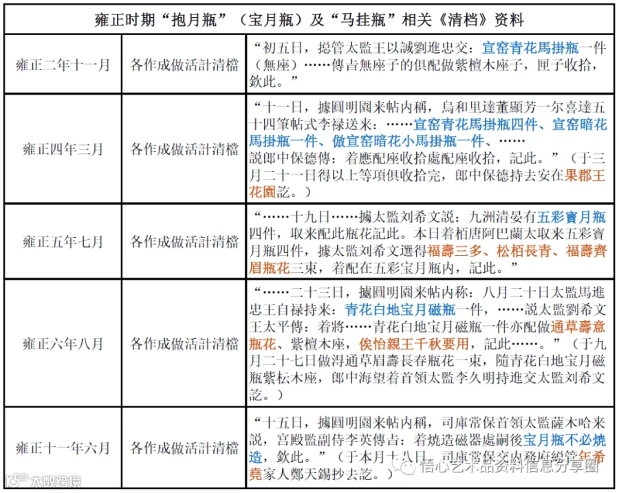 清代宫廷关于“宝月瓶”或“马褂瓶”的宫廷档案记录,据可查资料最早在雍正二年,之后几乎每年都会有同类型器物的配座或配花记录。其中雍正六年八月的《造办处清档》中,皇帝还亲自下旨将“青花白地宝月磁瓶”配“通草壽意瓶花”,特供“怡親王千秋要用”,可见当时雍正帝对此种青花宝月瓶的重视程度。直到雍正十一年六月《清档》中有记:“……宝月瓶不必焼造……。”