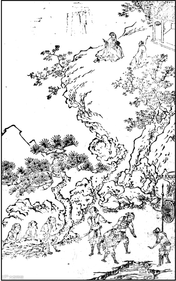 画面一侧绘孔明倚石而坐,于池边悠闲观鱼,营造氛围看似闲适,却于人物眉目之间可见思虑之状。另侧诸人站立,其中衣着装饰最为精致者为后主刘禅,刘禅身旁侍从手执仗义扇,小心服侍。所绘图景与明末《遗香堂绘像三国志》“安居平五路”一幕画意相仿,皆为表现后主刘禅上门求救诸葛亮之情节。