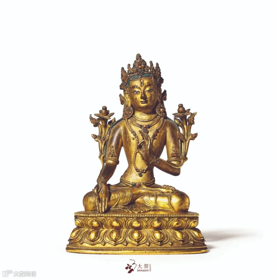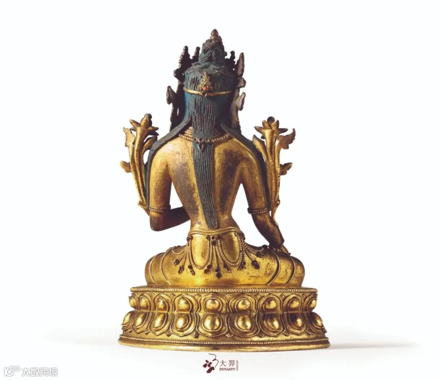 白度母为长寿三尊之一,以面部、手心及脚心共具七眼为身份标识。此尊头戴花冠,长发及腰,面庞圆润,相容和煦。身着天衣绸裙,细腰丰乳,体态婀娜。两茎莲花顺臂而上,齐肩绽放,花蕊镶嵌宝石。右手置膝施与愿印,左手当胸结说法印,全跏趺坐于莲台上。台座莲瓣圆润饱满,并保留了原封底,愈显殊胜。在西藏,入嫁吐蕃松赞干布的尼泊尔尺尊公主被奉为白度母的化身。