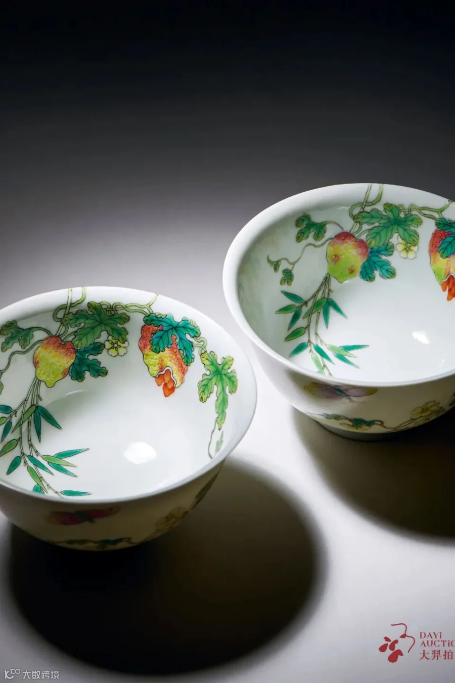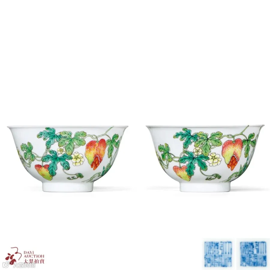 此对碗撇口,深弧腹,圈足。外壁所绘过枝癞瓜,从碗外壁牵连入碗内壁,内画苍劲挺拔的翠竹和闻香飘至的彩蝶,寄予“瓜瓞绵绵”之意,彩绘癞瓜之果肉效果尤佳,设色甚妙,红中带黄,黄中有绿,绚丽而又不失素雅。底书“大清乾隆年制”六字三行篆书款。