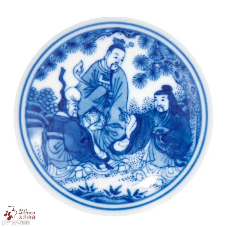 此对拍品敞口,弧腹,圈足。以青花绘纹饰,碗内青花双弦两周分列口沿、碗心,以作区隔。内壁釉色清洁爽亮,碗心绘福、禄、寿三星松林齐聚,寿星高额举桃,福星束发伸指,禄星持杖旁观,旷空山野之间,逸趣闲情。