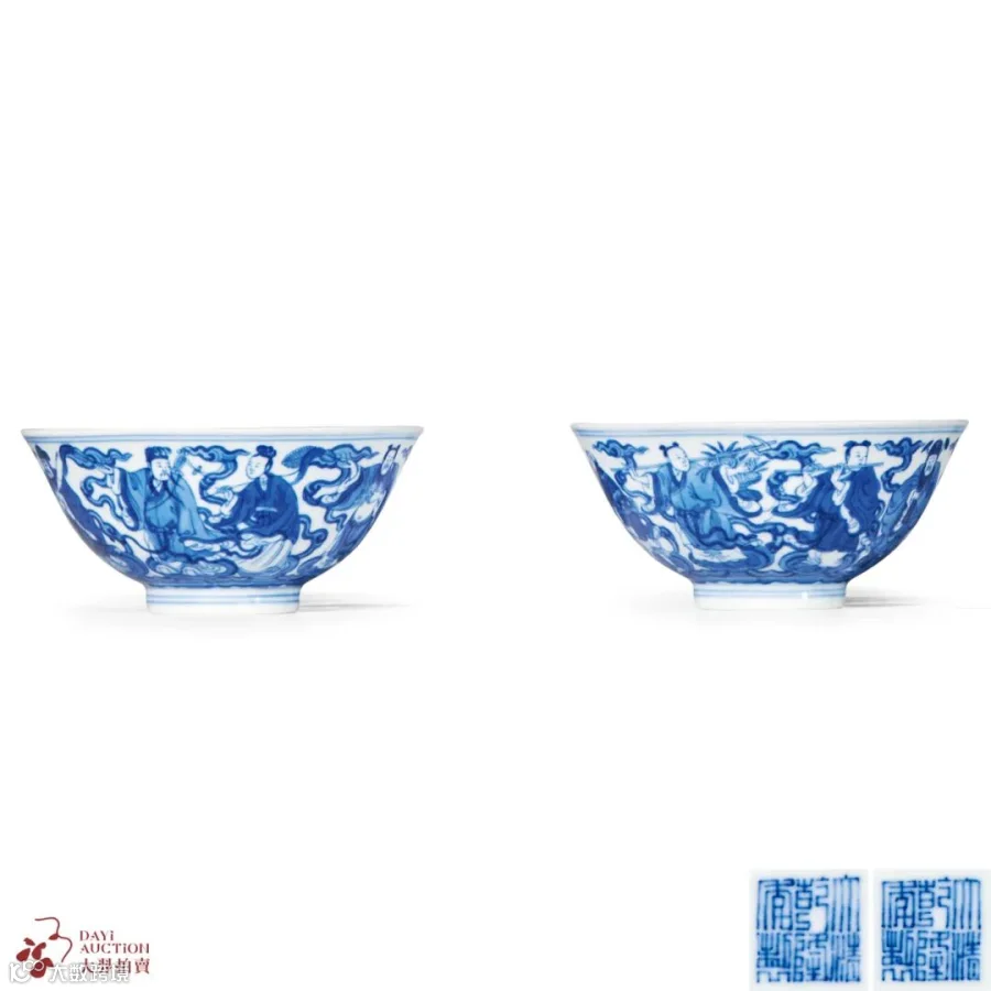 青花八仙祝寿纹碗一对