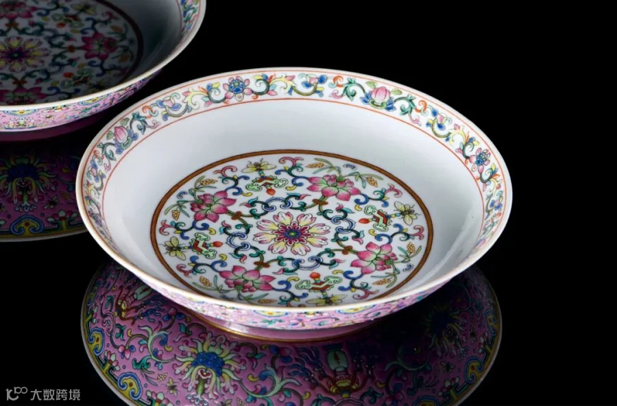 LOT801宫粉地洋彩缠枝莲五谷丰登纹盘一对全器纹饰对称布局,寓有五谷丰登、欢庆丰收等吉祥寓意,为清代宫廷用瓷之典范。清代官窑瓷器中,讲究吉庆祥瑞并融入西洋风格的纹饰以乾隆时期最具代表性,画面堆砌多种吉祥物象,布局对称严谨、繁密热闹,遂成官窑瓷器纹样之设计定式,影响及于清晚期。
