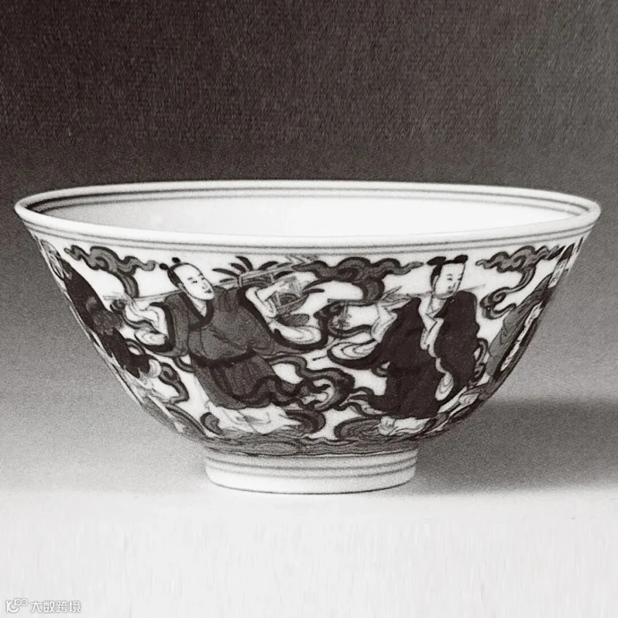汉钟离袒腹举捧还魂扇;李铁拐拄杖紧握仙葫芦;蓝采和宽衣洒带挑花篮;韩湘子凝神远望吹横笛;曹国舅高抬绰板;张果老谨抱鱼鼓;吕洞宾负剑直身,何仙姑轻盈持莲,八仙共踏行于海,周流云飞卷,衬托仙容善貌。 青花八仙图碗系清代官窑经典品种,创自雍正时期。乾隆朝将细节稍作变化,使其定型成为后世典范。南京博物院藏例,可资参阅。