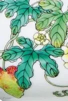 癞瓜又称癞葡萄、野葡萄,与苦瓜同科而不同种,瓜面颗粒状凸起,成熟时颜色鲜艳,自然开裂,露出鲜红的瓜瓤,其籽多而饱满,故被认为有多子多福的美好寓意,于清代常作为吉祥纹饰使用。瓜瓞连绵出自《诗经·大雅·绵》:“绵绵瓜瓞,民之初生,自土沮、漆。” 瓞,指小瓜,沮、漆都是水名。意思是说周人的祖先像瓜瓞的岁岁相继一样,传到太王才奠定了万世基业。后来世人就用瓜瓞绵绵作为祝颂他人子孙昌盛的吉祥语。