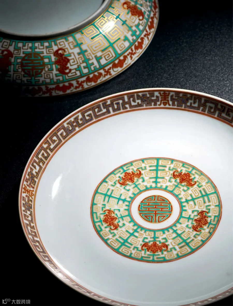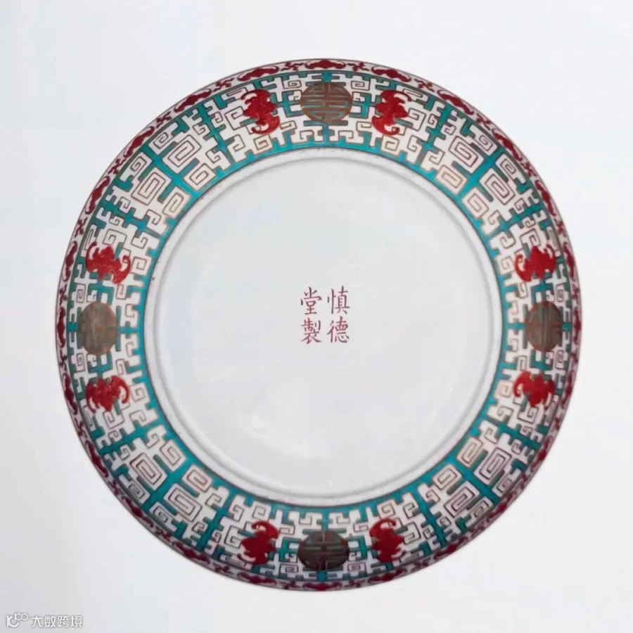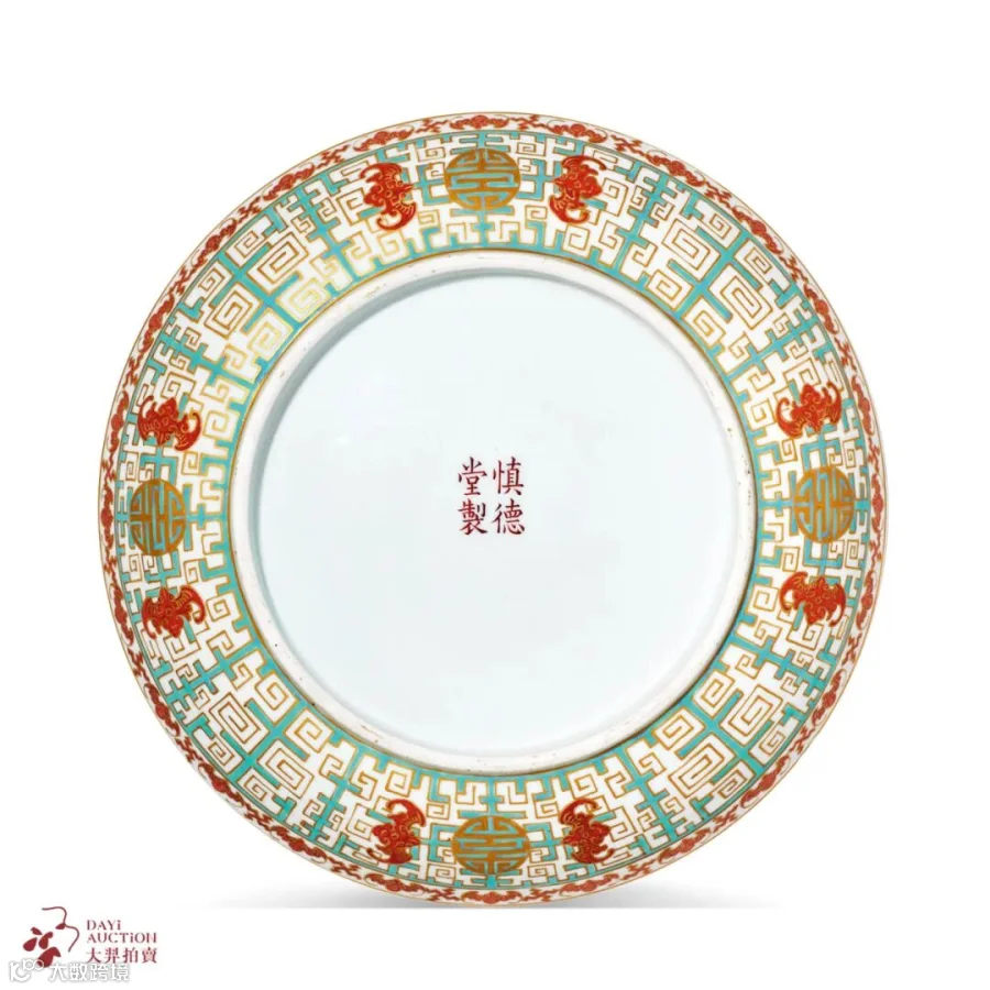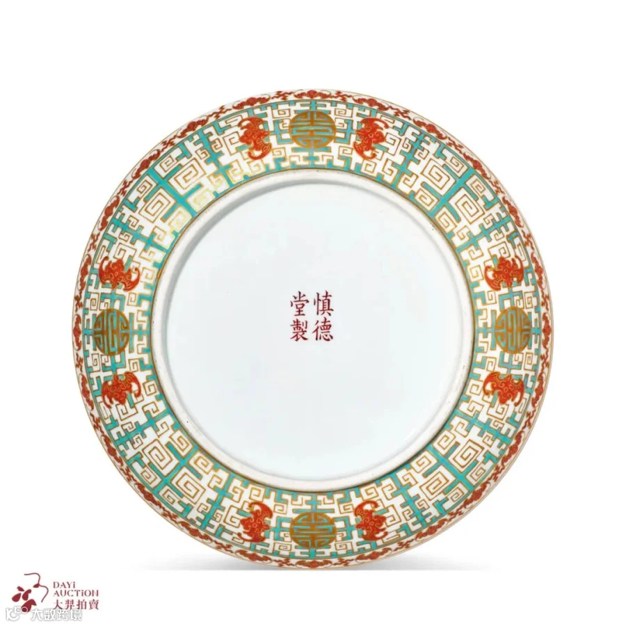 拍品内外装饰粉彩螭龙地福寿纹,内壁口沿处蓝彩绘一周夔龙纹,间以四组寿字纹饰,盘心一圈绿松石绿釉地描金夔龙纹,上加绘五组红彩描金蝠纹,里心绘红彩描金团寿字,外壁口沿处红彩绘一周蝠纹间以万字纹,外壁绘松石绿釉地描金夔龙纹,其中加绘四组红蝠团寿纹,“蝠”与“福”谐音与万字纹搭配,寓意万福万寿,外底心矾红书“慎德堂制”四字双行楷书款。