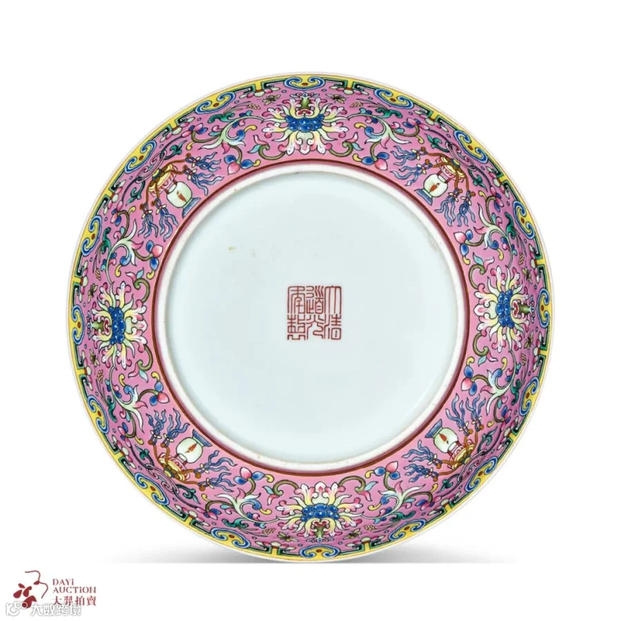 拍品品种少见,内外均饰以粉彩吉祥纹样,外壁施粉红彩为地,饰粉彩缠枝西番莲和宫灯,隙地绘稻穗、蜜蜂、卷草等,口沿内饰粉彩寿桃、莲花,枝蔓相互勾连,绕内壁一周,盘心则绘粉彩荷花、磬、稻穗、蜜蜂等组合成团。