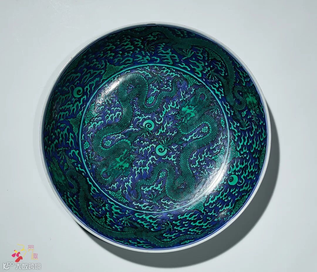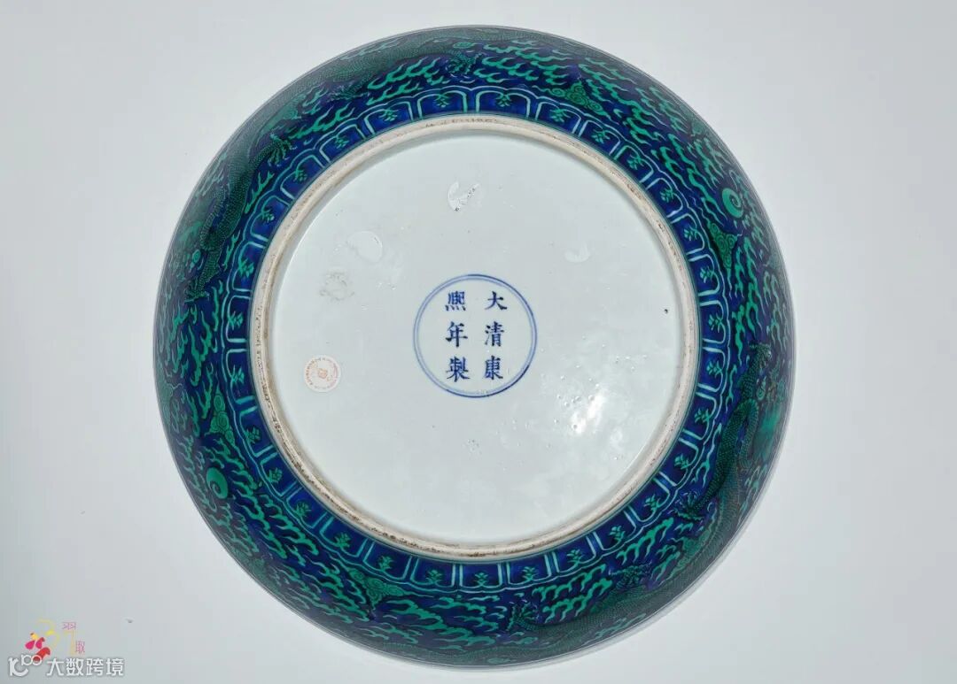 拍品纹饰繁满,画工精细,线条流畅。盘外壁以青花为地,上用绿彩绘火焰腾龙纹与十字祥云纹,烈焰翻滚间,腾龙奔驰有力,盘心双龙戏珠,龙身成“弓”形,身姿矫健,眼神犀利如锋,形态凶猛,极具康熙朝之威严霸气。其装饰方法系在成型胎上先用青花铺地并勾勒纹样的轮廓线后填色,形成绿龙青地的色泽效果。绿彩鲜艳明亮,青花浓淡不一,有水印痕,为康熙五色青花的典型色泽。康熙一朝此类瓷器传世数量远不及雍正乾隆朝多,故较为珍贵。