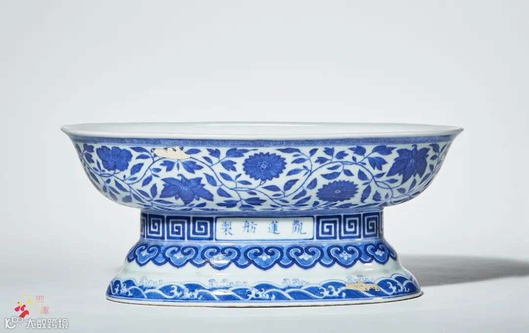 拍品敞口,深弧腹,高足外撇。通体饰以回纹、缠枝花卉纹、卷草纹、如意纹,海水纹分为六层纹饰,层次分明。于胫部回纹间,以青花书“观莲舫制”四字楷书款。整体造型规整,青花发色淡雅,纹饰布局疏密有致,高贵典雅。