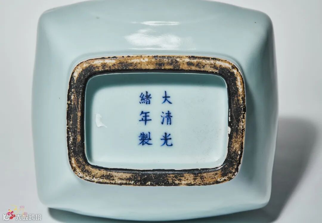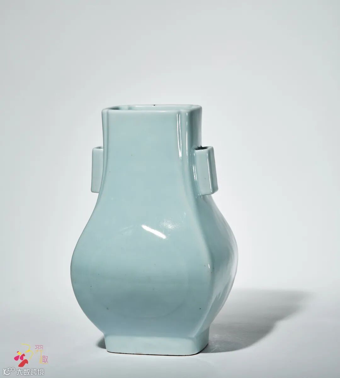瓶口倭角近似海棠形,直颈两侧饰双贯耳,长方扁腹至下外鼓,腹部扁圆,两面饰凸起的杏形开光,长方形圈足,足内书大清光绪年製六字双行楷书款。贯耳瓶流行于宋代,其器形仿汉代投壶式样,直颈较长,腹部扁圆,圈足,颈部两侧对称帖竖直的管状贯耳,哥窑、官窑、龙泉窑等多有烧制。清代亦有仿制,乾隆时对原有的贯耳瓶在器形及装饰上进行改造,称为四方杏元双管瓶,其造型深受乾隆皇帝喜爱,景德镇御窑厂曾烧造了多种色釉的贯耳瓶,以供乾隆帝赏玩。此类器形后成官窑经典,历朝均有烧造。光绪朝时,四方杏元双管瓶较常见的釉色有窑变釉、仿哥釉、仿官釉、厂官釉、霁蓝釉、粉青釉等,其中仅前两者为大运琢器固定品种,粉青釉作品则传世量较少。
