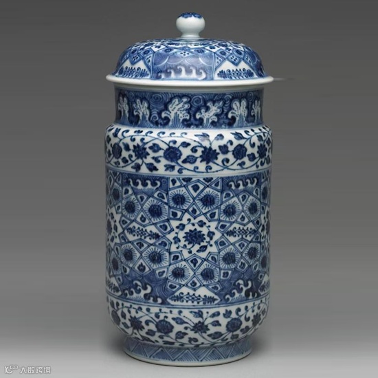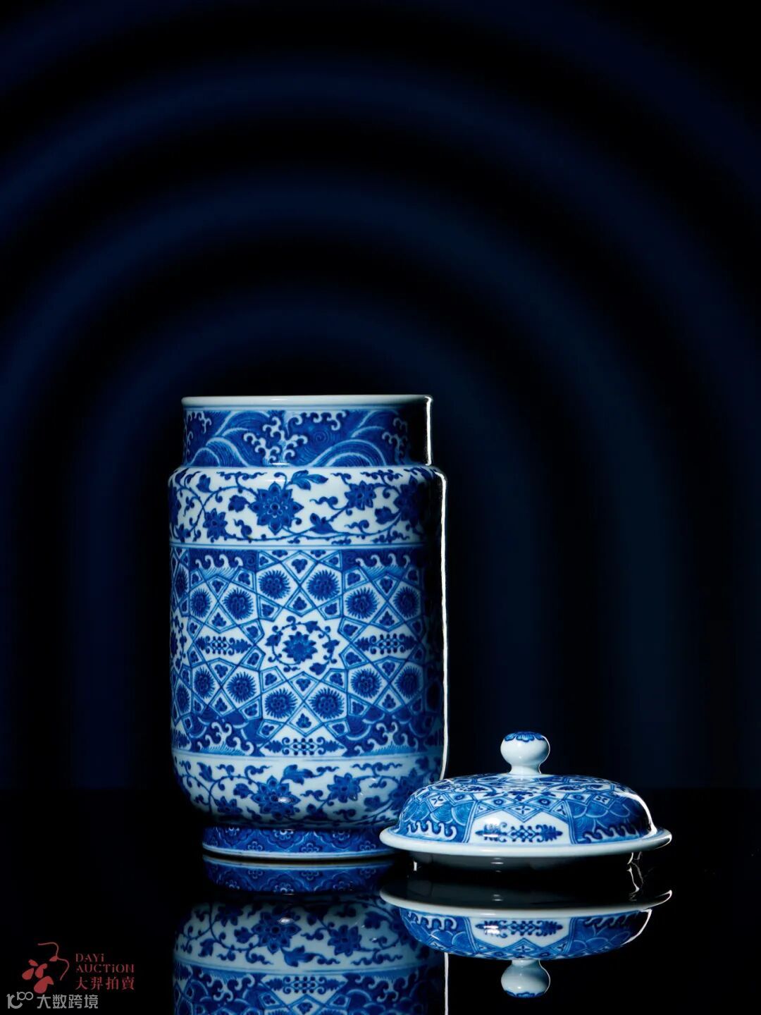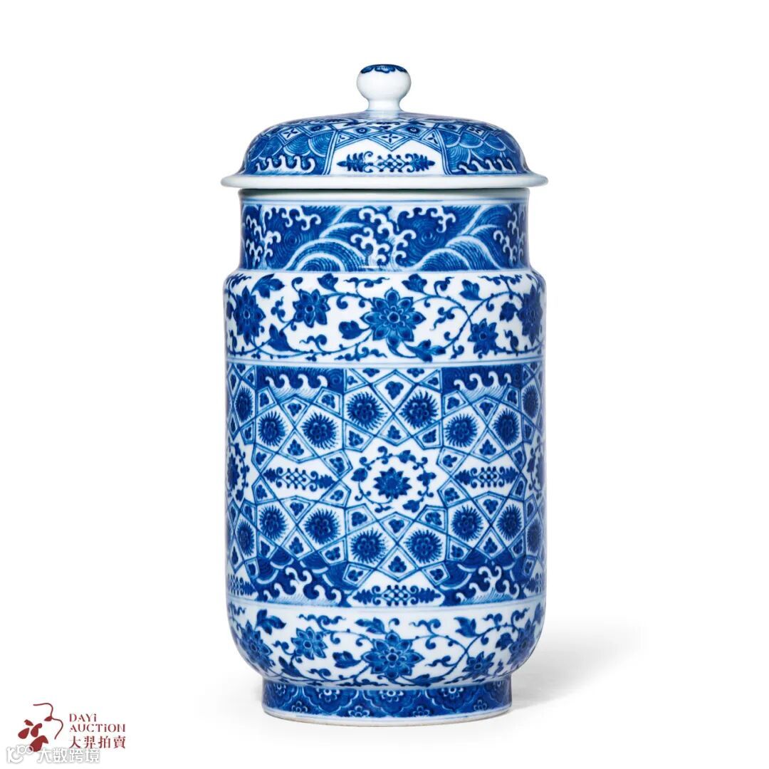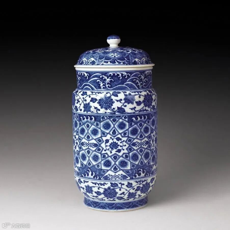 本品器形挺拔端庄,盖罐相合,盖设宝珠钮;罐直口,折肩,筒腹,腹下内折,造型规整,胎体细腻坚致,釉面光润。通体以青花装饰,罐颈部绘海水纹,肩部及胫部绘缠枝花卉纹,腹部与盖面纹饰相同,皆绘连续几何纹,内填以梅花纹,隙地间饰缠枝莲花及海浪,纹饰繁芜细丽,描绘精细,青花发色典雅,为乾隆御窑追慕永宣佳器之典范。