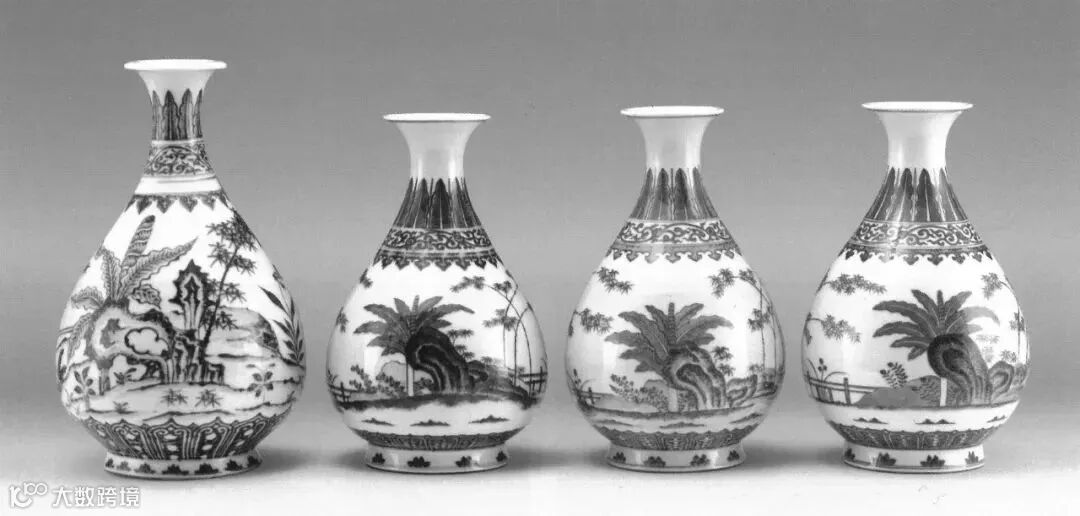 青花竹石芭蕉图玉壶春瓶始见于明初洪武、永乐官窑,其造型挺拔隽美,尚有元代遗风,青花发色深艳,并有星点铁锈斑,画法流畅写意,时代特征明显,为明初官窑的经典作品。(参见《故宫博物院藏明初青花瓷》上册,页44、45,图18)入清之后,康熙朝首先开始摹仿明初之作,线条庄重大气,画法颇具康熙本朝特点,以这一时期所特有的“披麻皴”、“斧劈皴”手法绘制芭蕉洞石,层次感强,青花颜色也艳丽有加。
