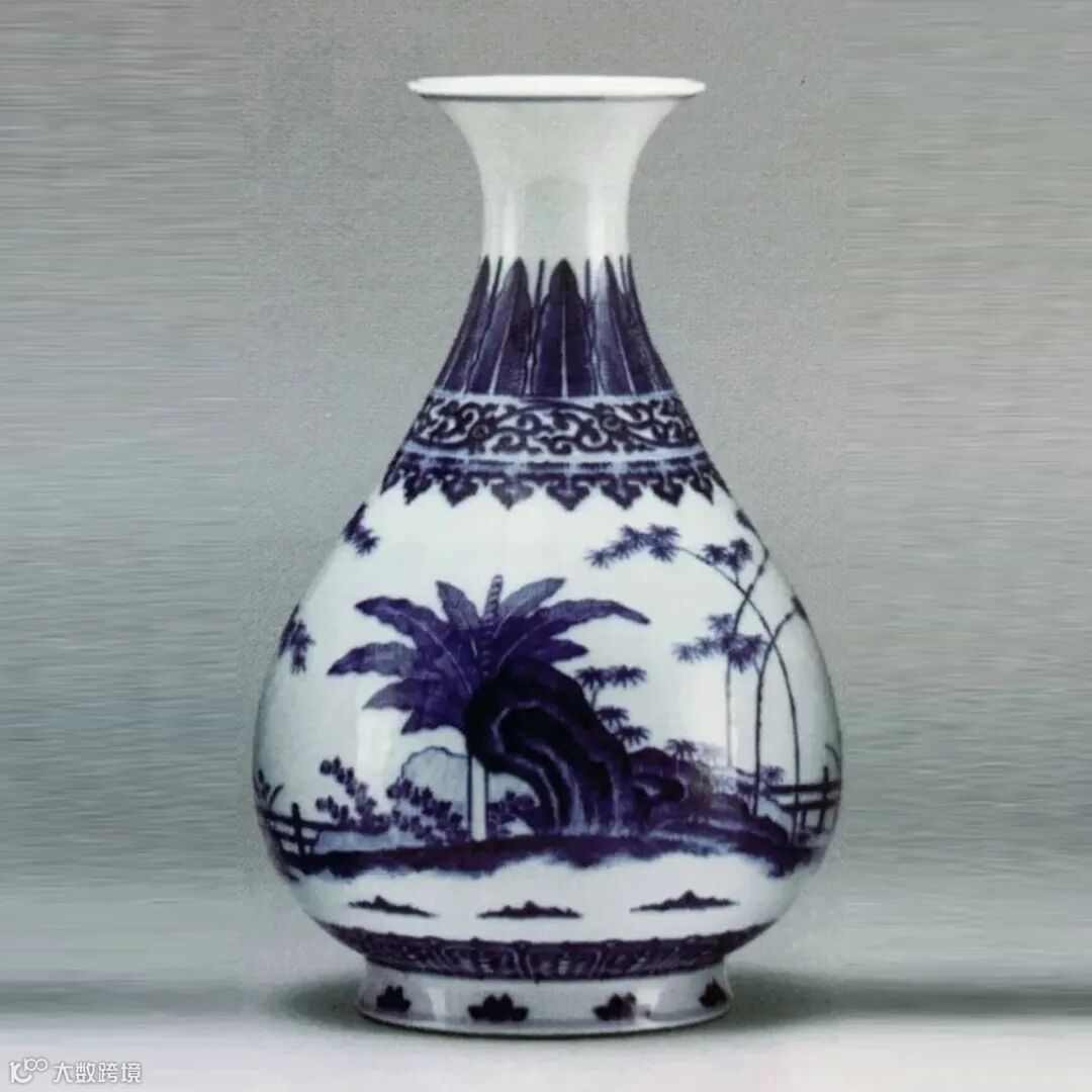 拍品撇口,细长颈,下腹略垂鼓,圈足外撇。造型周正俊秀,外形线条流畅优美。胎质细腻,通体施白釉,釉面光滑莹润,腹部饰青花芭蕉竹石图案,栏杆周围,芭蕉和兰竹生于奇石之间,生机盎然,富有园林小景的别致趣味,纹饰描绘细腻,富有层次感,地面皴法技法轻轻绘出,笔意娴熟,构图疏朗得当,给人以水墨小品画的清幽之境。颈部饰蕉叶纹,卷草纹以及灵芝云纹作饰,底端为明清时期习见的变体莲纹。