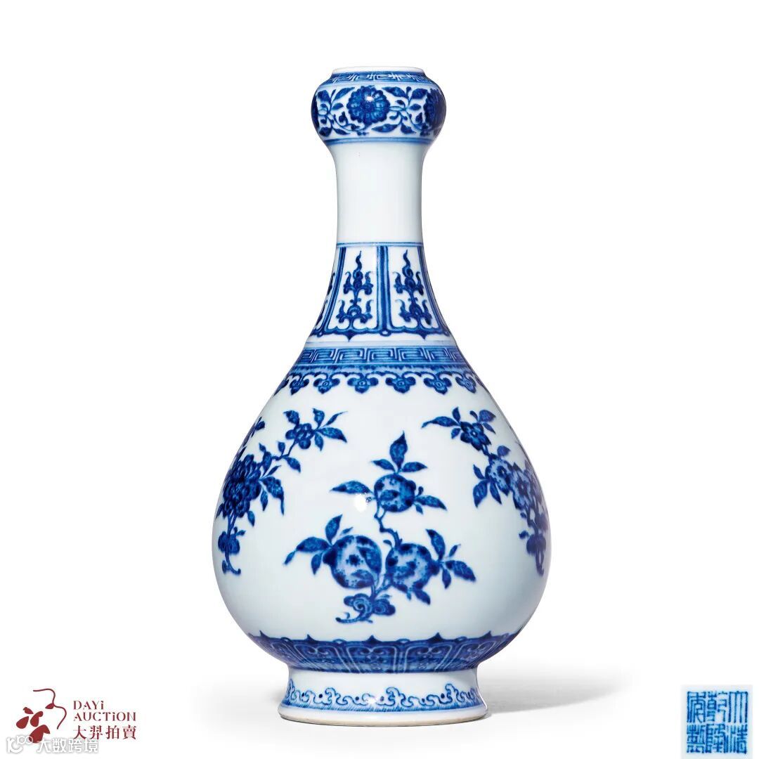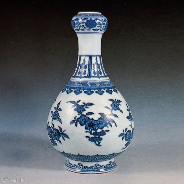 此瓶蒜头形口,长颈微束,溜肩鼓腹,高圈足略外撇,造型挺拔俊美,胎质细腻坚实,釉面平整温润。蒜头瓶因瓶口形似蒜头而得名,始见于汉代青铜器造型,瓷制者则以明嘉靖、万历两朝为盛。清代官窑沿用此种器形烧造宫廷陈设用瓷,尤以乾隆时期的青花品种较为名贵。