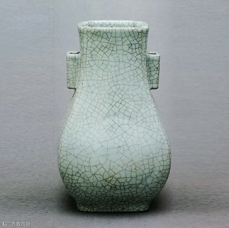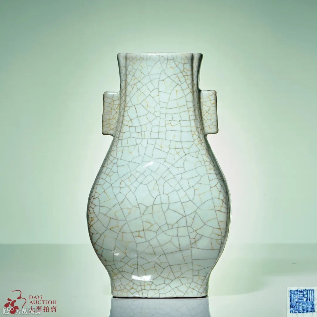 另一件乾隆仿哥釉,贯耳瓶为清代官窑的传统品种,最早由宋代官窑仿古代青铜投壶演变而成。器身通体施仿哥釉,肥腴莹润,开片分明,金丝铁线交错,古趣盎然。瓶作四方倭角形,双贯耳,鼓腹,腹部两个杏形图案凸起,造型古朴典雅。长方形圈足,足际刷铁黑色釉,乃仿哥窑“铁足”的特征。