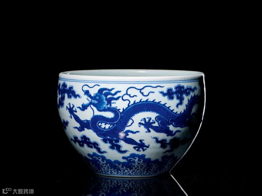 另一件慕古拍品为LOT258清乾隆 青花云龙海水纹案缸,器型小巧,可置于案头。其造型来源于嘉靖官窑龙缸,稳重规整,胎骨坚致厚重,外壁以青花绘云龙纹,双龙前后呼应,一改以往双龙前后追赶状,代之为一龙回首,一龙追逐,矫健生动,龙身遒劲,形态凶猛,毛发似随风飘动,动感十足。