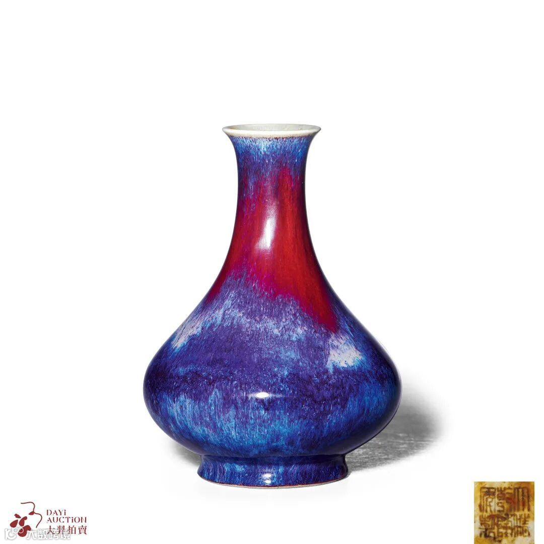 窑变色在清代被视为祥瑞,经苦心钻研,乾隆时御窑已能通过控制配料和窑炉火候、氛围,人工烧造出精美的窑变釉色。拍品撇口,长颈,圆鼓腹,圈足,秀丽端庄,通体施窑变釉,红、蓝、紫等彩相叠相融,迷离迤逦,好似紫霞般璀璨,妙不可言,正如古人谓之“夕阳紫翠忽成岚”。底部着意摹仿钧窑,覆以酱色混灰白亮釉,底部正中「大清乾隆年制」六字三行篆书刻款,此类拍品可见英国维多利亚和阿尔伯特博物院。