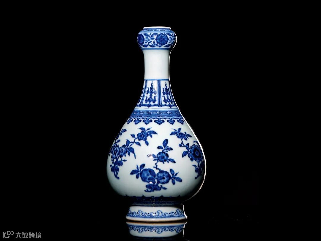 瓶通体以青花描绘,口肩分饰回纹、缠枝花卉、莲瓣及如意云头等五条纹饰带,腹部主体以“三多”为主题纹饰。整体布局疏密得当,错落有致,青花色泽艳丽,笔触点染之法为仿永宣青花铁锈斑式样,是乾隆时期景德镇御窑厂的精心之作。