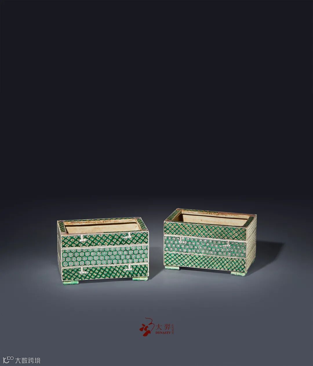 此对拍品呈函式古书之形,直腹,下承四足。其以素 三彩绘织锦纹,一侧堆贴绳栓,惟妙惟肖,生动传 神。拍品釉面莹润,形制秀雅,绘画精细,极富文人 气息,十分珍贵。