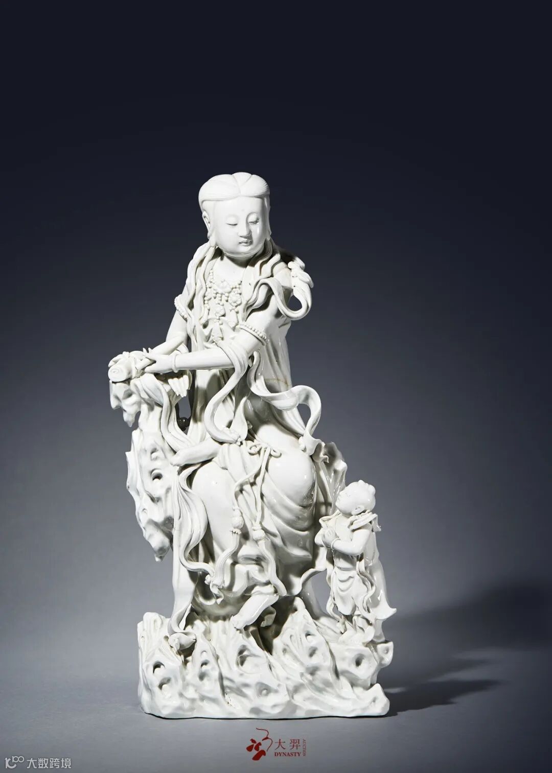 此尊瓷塑观音为典型的德化窑作 品,观音束发垂目,两耳硕长,身 着开胸长衫,胸前佩戴璎珞饰物, 衣纹垂拂自然,赤足坐于山石之 上,旁立童子,据此亦可知该瓷塑 为送子观音。通体施莹润的象牙白 釉,雕刻刀法细腻,一丝不苟, 手、足、毫发之间尤见功力。