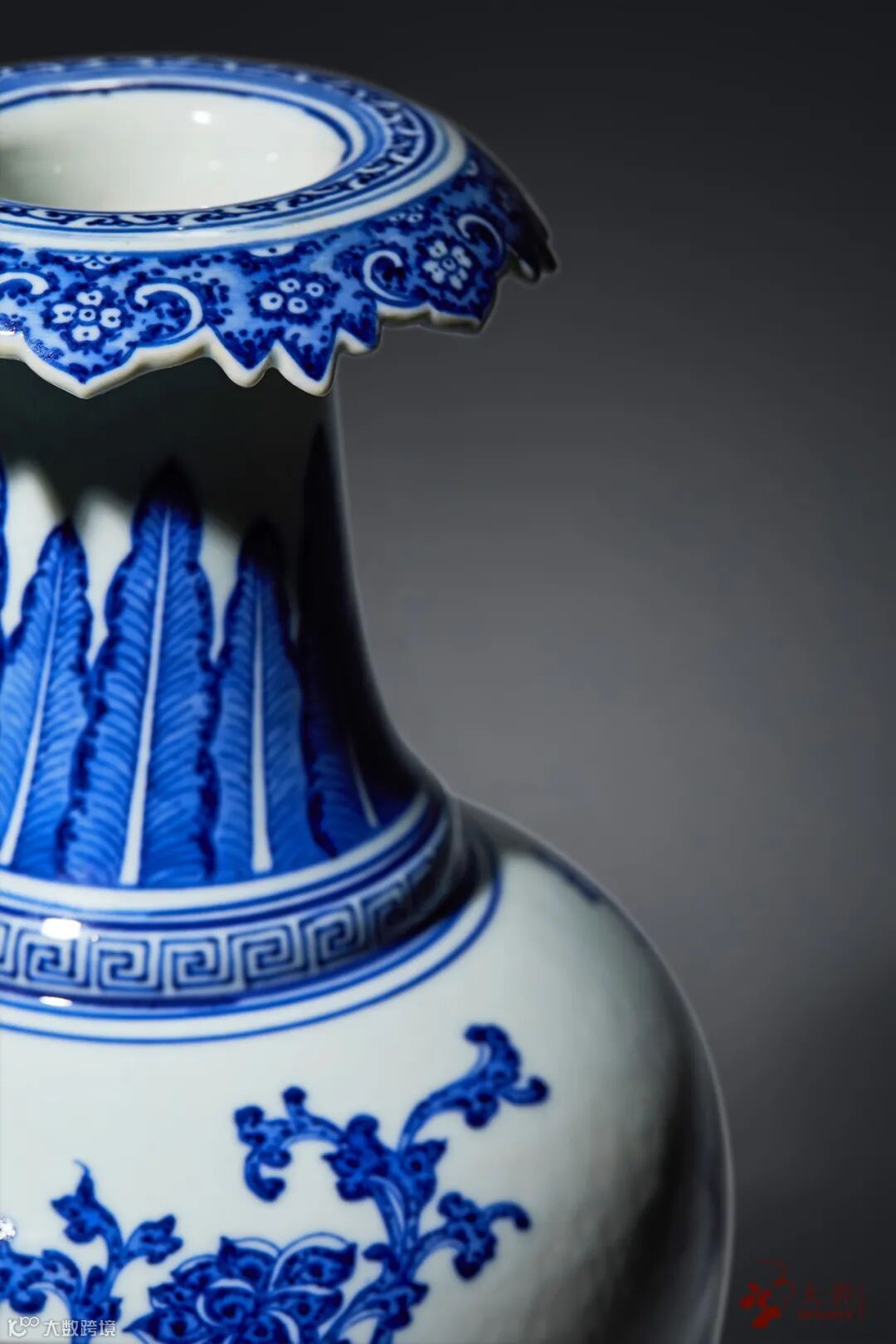拍品口沿唇外翻饰有一周似雕瓷如意形瓣,置顶部有青花弦纹一道,亦在每瓣之 内饰以青花梅花瓣,细节之处皆描绘俱细;直颈,溜肩,圆腹,圈足外撇。由上 至下饰有六层纹饰,颈部作蕉叶纹,颈部与肩部之间以一周回纹,相接处别具匠 心的饰有弦纹,应意为颈肩相隔之用;腹部主体作折枝花卉纹三组,枝叶花蒂笔 触细腻,青花设色细分阴阳浓淡,逸丽柔和,颇富立体感。圈足处亦饰有回纹及 变形莲瓣纹以作呼应。底部圈足修整细腻。器形庄重,绘工精谨,青花精良,构 图简洁大方,器形硕大,庄重雄伟,雍容高贵之感自现,堪称隽永上品。