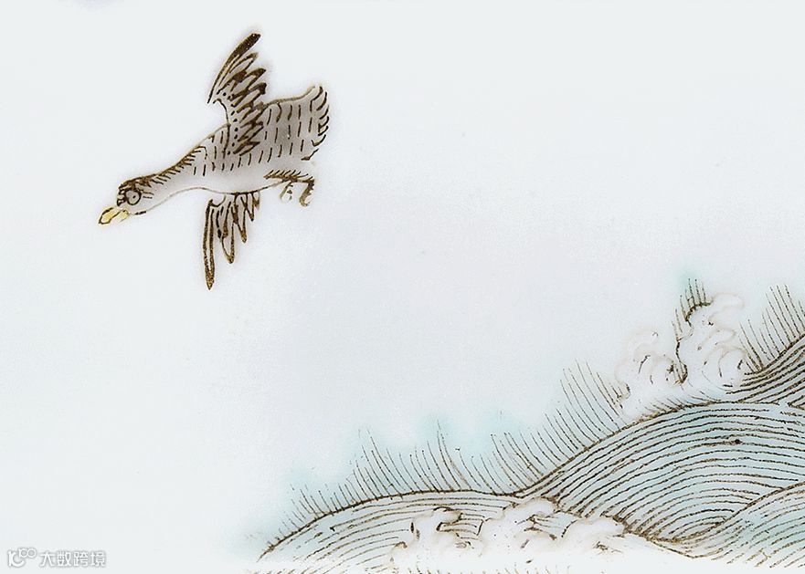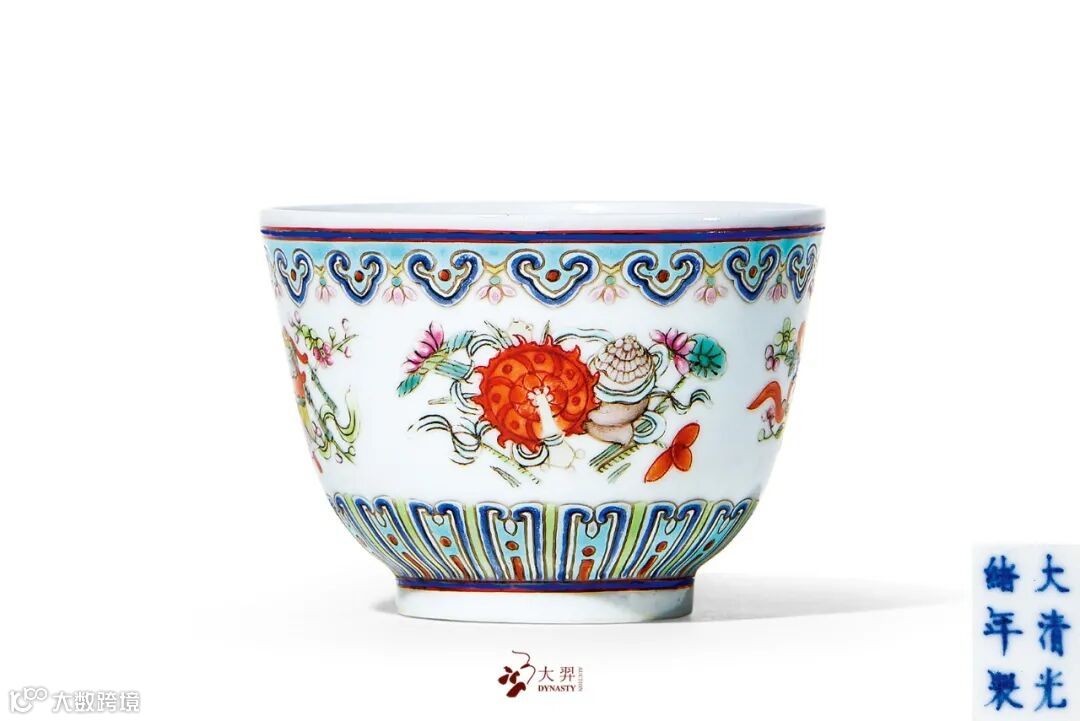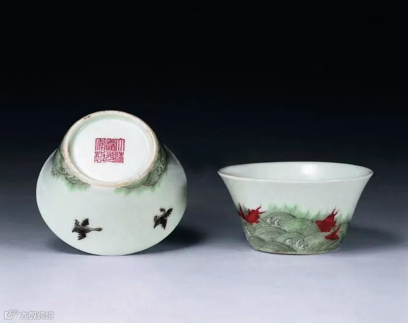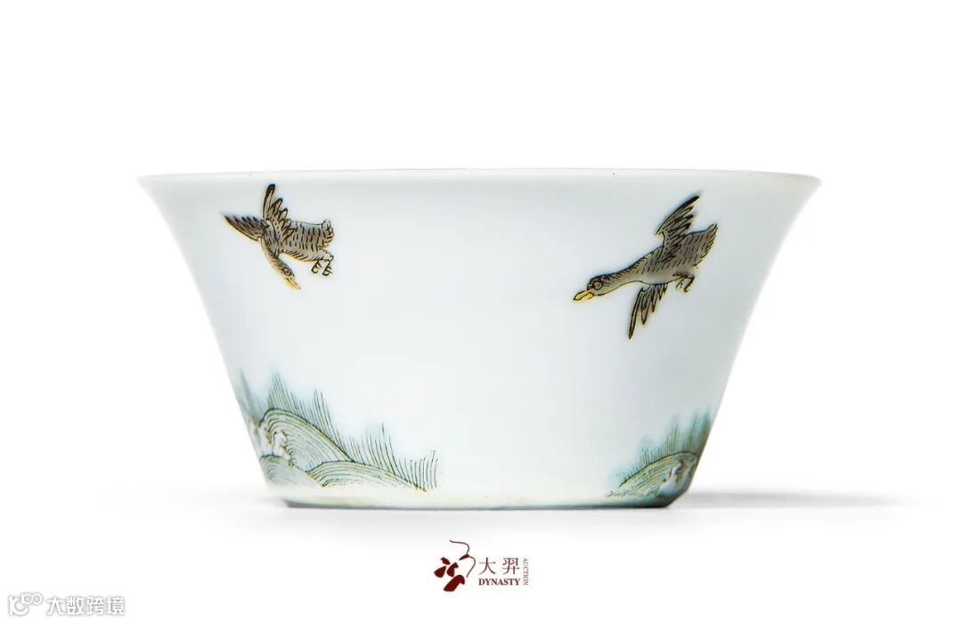 杯小巧而雅致,敞口斜腹,浅凹圈足。外壁以粉彩绘红鲤跃于海涛之上,波涛翻涌,白浪滔天,另一侧以墨彩绘对雁,意取“海”、“雁”的谐音,寓意“海晏河清”。其典出唐代郑锡《日中有王子赋》:“海晏河清,时和岁丰。”有太平盛世之美好寄托。本品纹样及造型皆新颖少见,器底书“大清道光年制”六字三行篆书款。