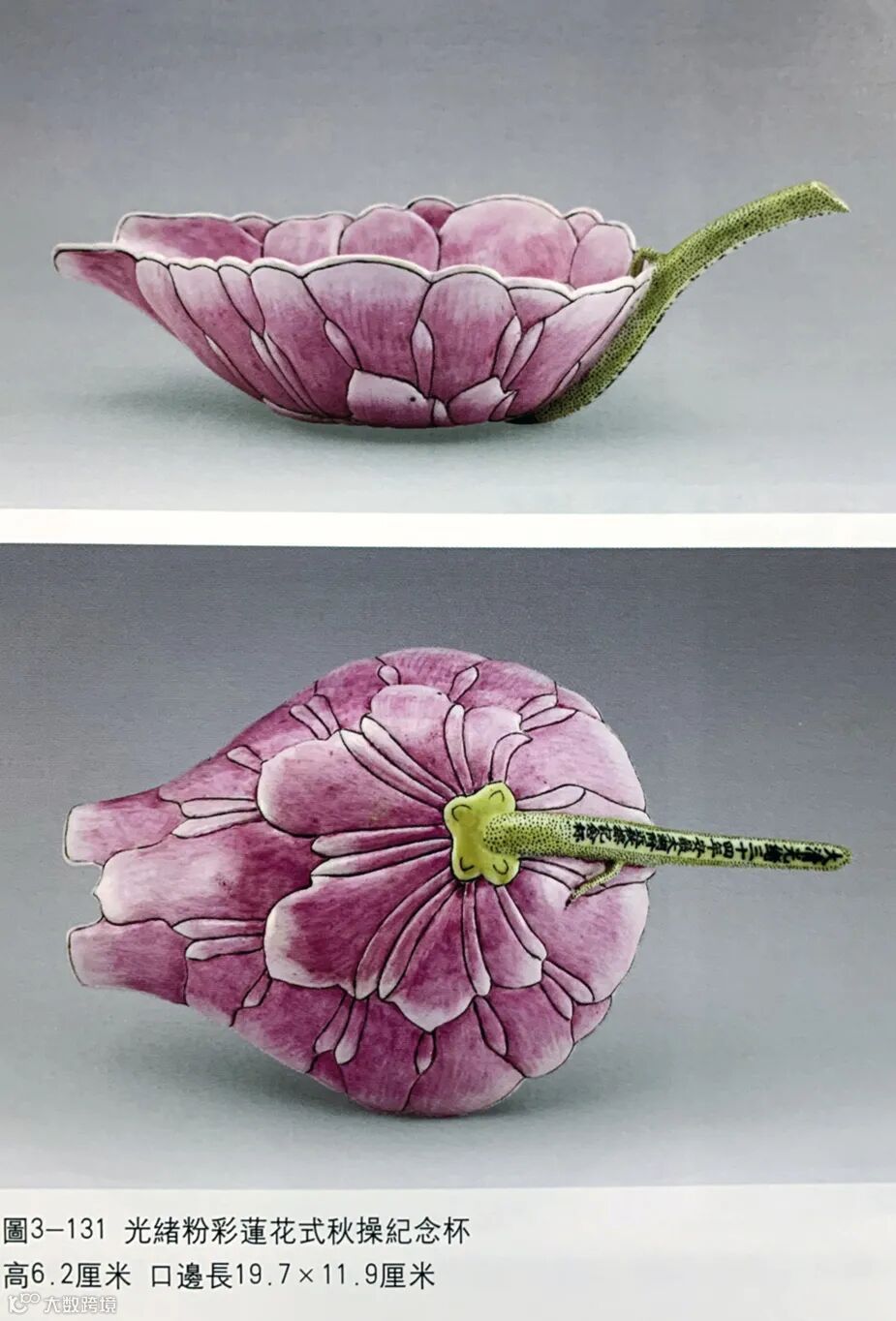 此对杯名秋操杯,是中国官窑历史上较为少数的纪年杯,为晚清光绪年间所举办的几次军事操练所定制。清光绪三十一年至三十四年,共举行过三次秋季大型军事演习,由此杯落款“大清光绪三十四年安徽太湖附近秋操纪念”可知,此对杯为“彰德秋操”所制纪念杯。造型仿生莲花样式,莲瓣为器身,莲梗为柄,莲梗内空,从梗茎端直通杯内,可以吸水,故又名吸杯,其造型源自康熙时期,构思巧妙,不胜清雅,故宫博物院亦有相类藏品可兹比较。