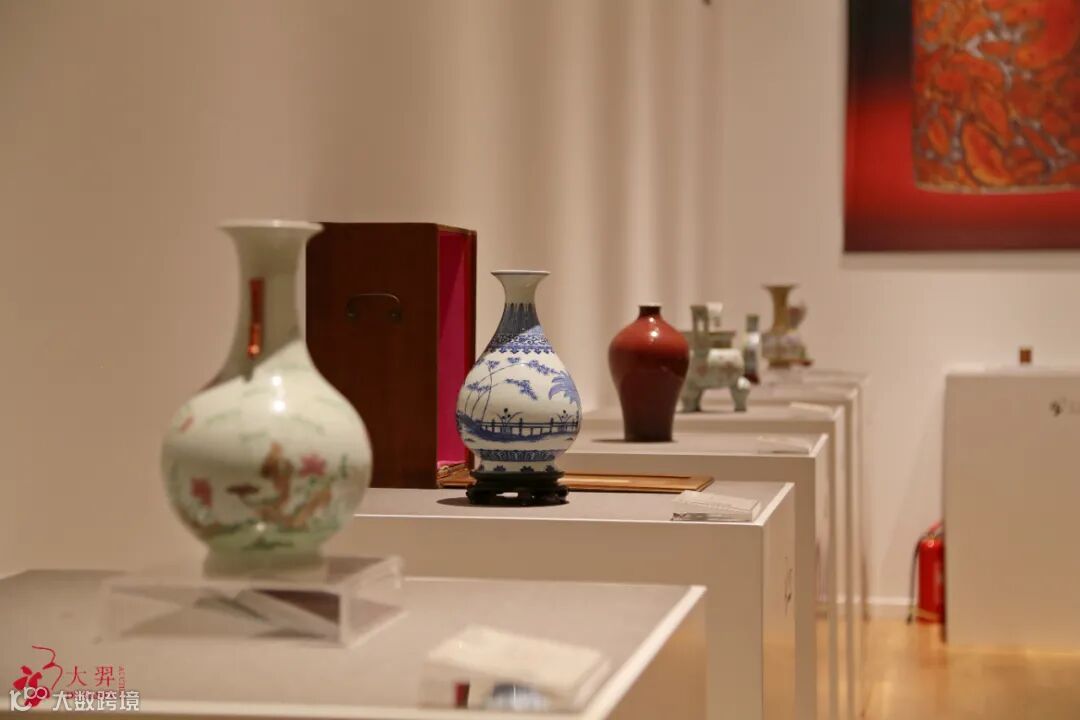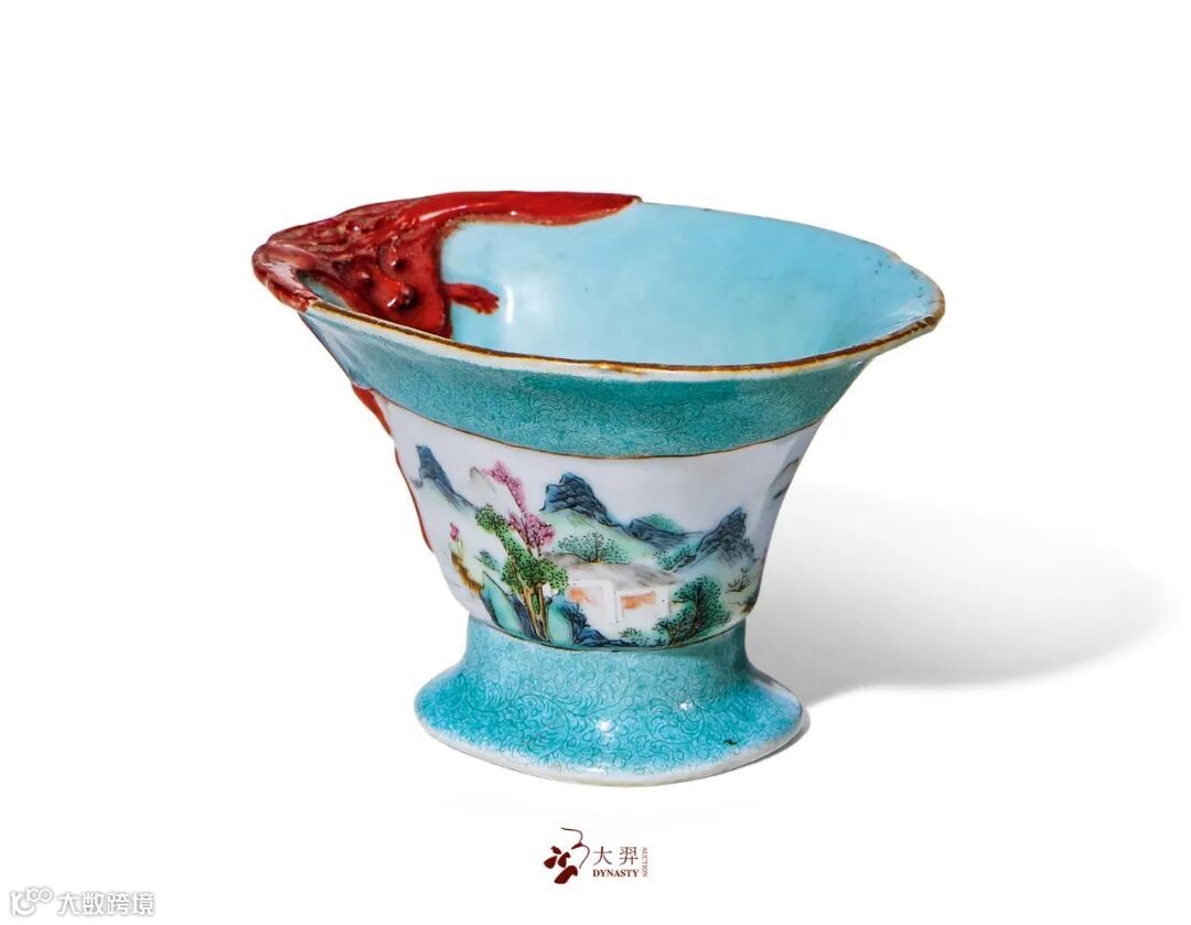 此杯造型小巧,敞口,斜腹,底部圈足外侈。造型仿商周青铜爵之形制略加今人巧思化裁而成。通体罩施松石绿釉,色泽明媚鲜妍,腹部以白釉为地,其上粉彩通景式绘饰山水人物图,远山如黛,春水微澜,更兼翠树繁花,临水轩榭,一派文人画境。杯侧以矾红填饰,更添吉意。即可自饮自酌,亦可悦心把玩。
