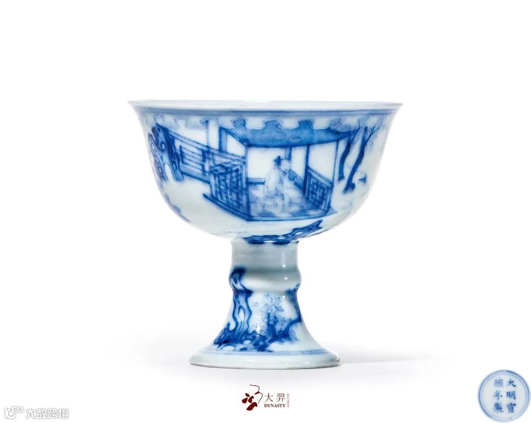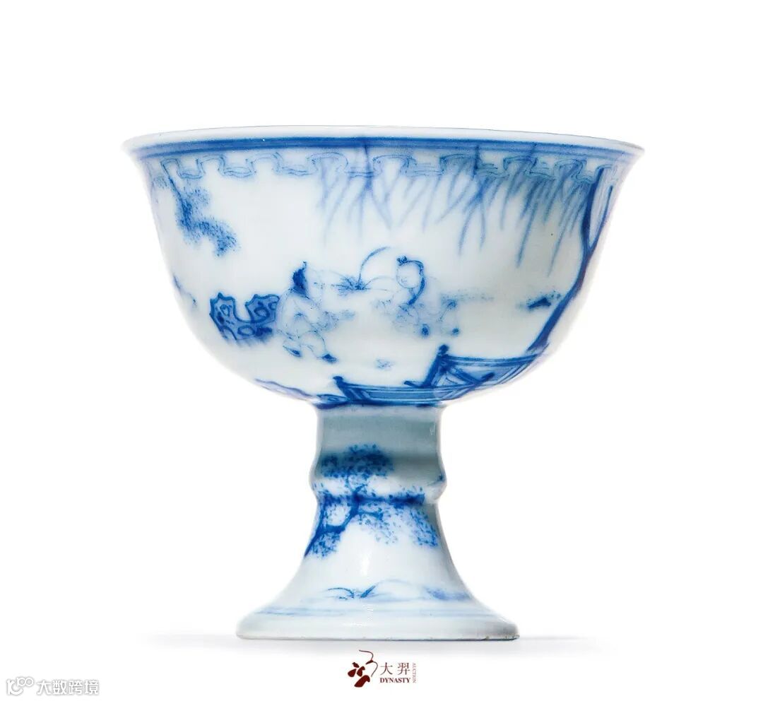 拍品口外侈,深腹,高足外撇。通体施白釉,白中泛青,杯腹青花绘高士独坐图案,以深浅不一的青花表现出生动的人物景物。发色清淡幽蓝,绘画细腻精致,人物个性鲜明,青花皴擦渲染,浓淡相宜。为文房案头之雅器
