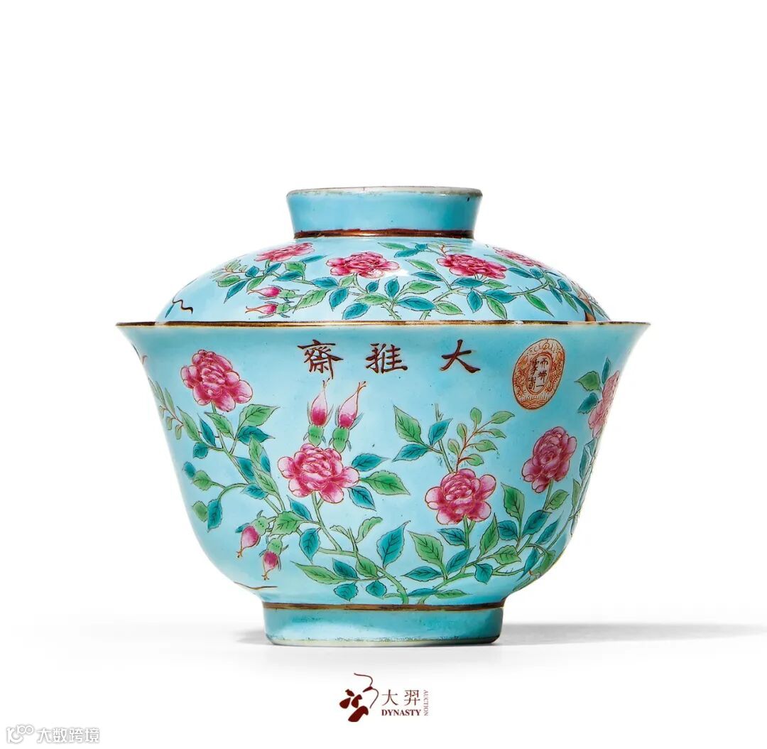 碗敞口微侈,深弧腹,下承圈足,顶盖与碗相扣,盖面微弧,圆环形抓钮。外壁通施松石绿地,其上以粉彩绘紫藤牡丹纹样,藤蔓缠绕,诸芳似随风荡漾,娇艳无比,所绘花叶尽显轻盈之姿,诸彩研丽而不俗,出色匀凈明亮,口沿下以矾红书“大雅斋”三字楷书款,旁钤矾红双龙戏珠纹“天地一家春”篆书阳文印。盖钮内及外底施白釉,内心以矾红书“永庆长春”四字双行楷书款。