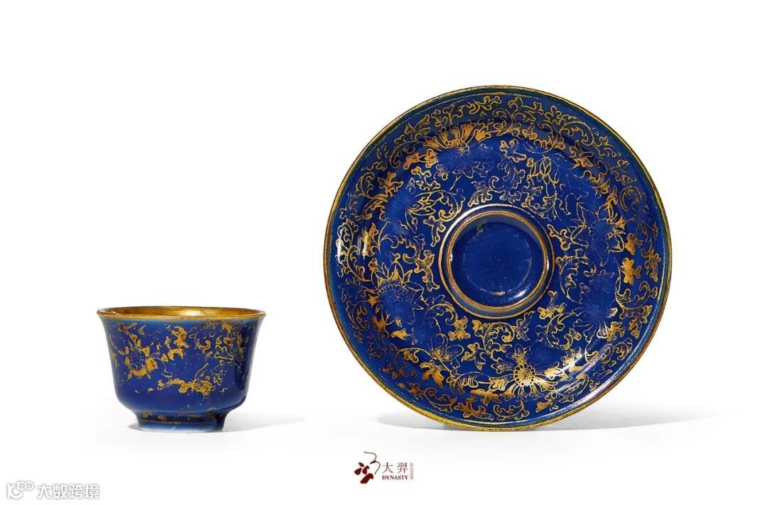 此套杯盏形制纤巧,隽秀典雅,盈手可握。通体罩施宝石蓝釉,釉色深靛凝润,其上以金彩绘饰纹样,以沈静肃穆的蓝釉为地,衬托釉上金彩的富丽耀目,装饰效果格外强烈。但惜年深月久,金彩略有漫漶。此类釉彩于乾隆一朝内府档案称之为“洋彩金花霁青”,数量十分稀少,且整器杯托相迭,成套而存,更是不为多见。