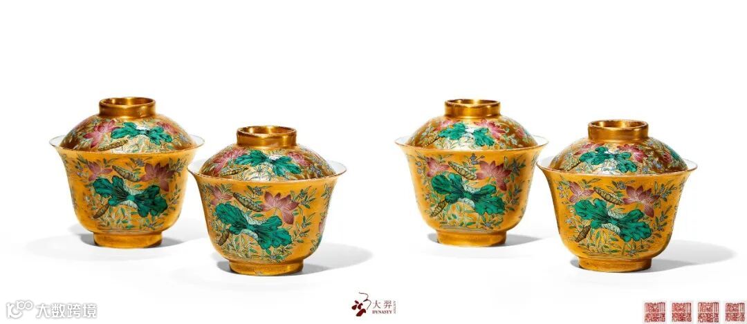 拍品为少见的金地粉彩品种,殊为难得。碗外壁和盖面以金彩为地,粉彩描绘荷塘清趣图,红、白二色荷花或盛放或含苞,鲜绿的荷叶宽大、舒展,偶有星点枯黄残损,芦苇穿插点缀,一派仲夏荷塘生机勃勃之景。全器纹饰布局繁密,描绘精细,荷叶、荷花饱满而富有张力。