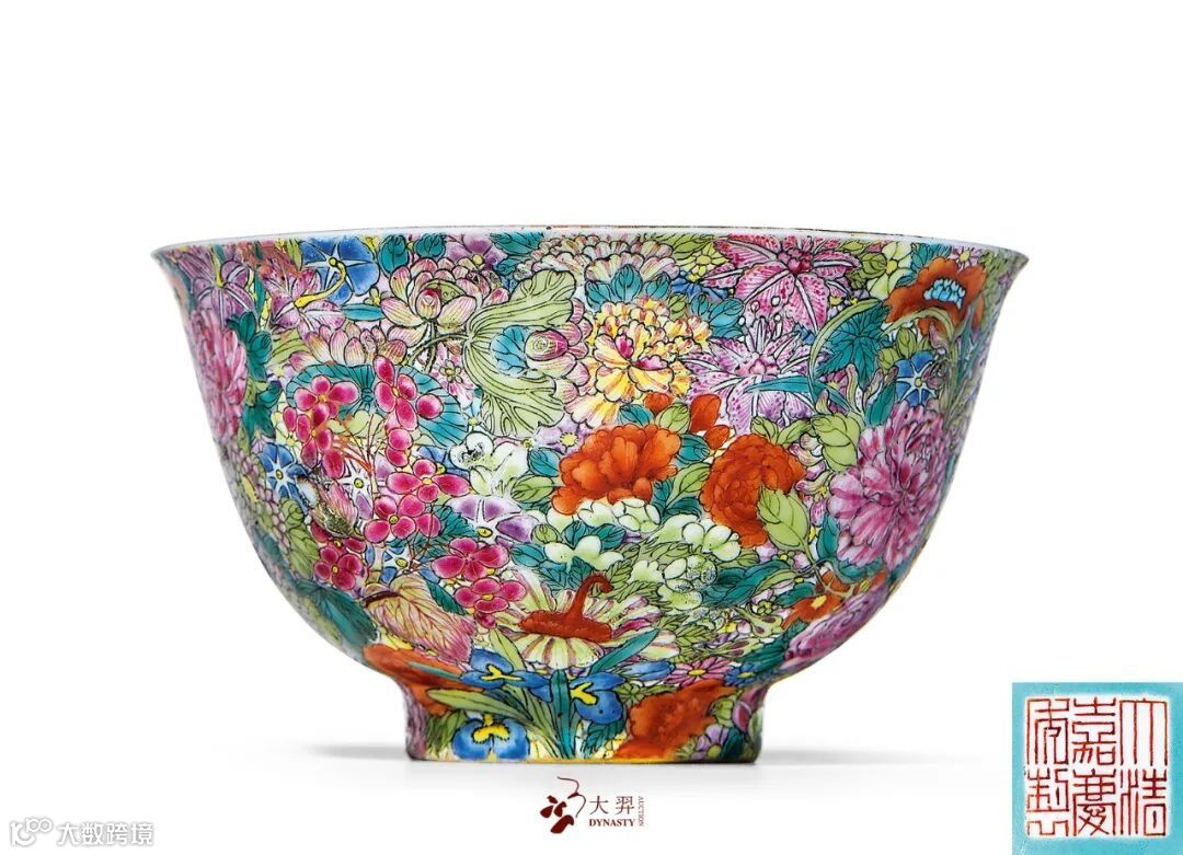 而本场清嘉庆粉彩百花不落地纹杯,口微外撇,弧腹下敛,圈足,造型典雅。口沿施金彩,底足内心与碗内皆施松石绿釉。外壁粉彩绘百花不落地,包括牡丹、菊花、茶花、月季、荷花、百合、牵牛花等等各种花卉图案,器不露地,寓意百花呈瑞,盛世升平。拍品为嘉庆朝华丽之作,此类百花不露地为粉彩名品,清宫档案旧称为“洋彩万花献瑞”,始创于雍正时期,流行于乾、嘉二朝。南京博物院藏有一件嘉庆粉彩百花图瓶,外壁以万花锦纹装饰,内壁施松石绿釉,其装饰手法与拍品相同,可资比较。