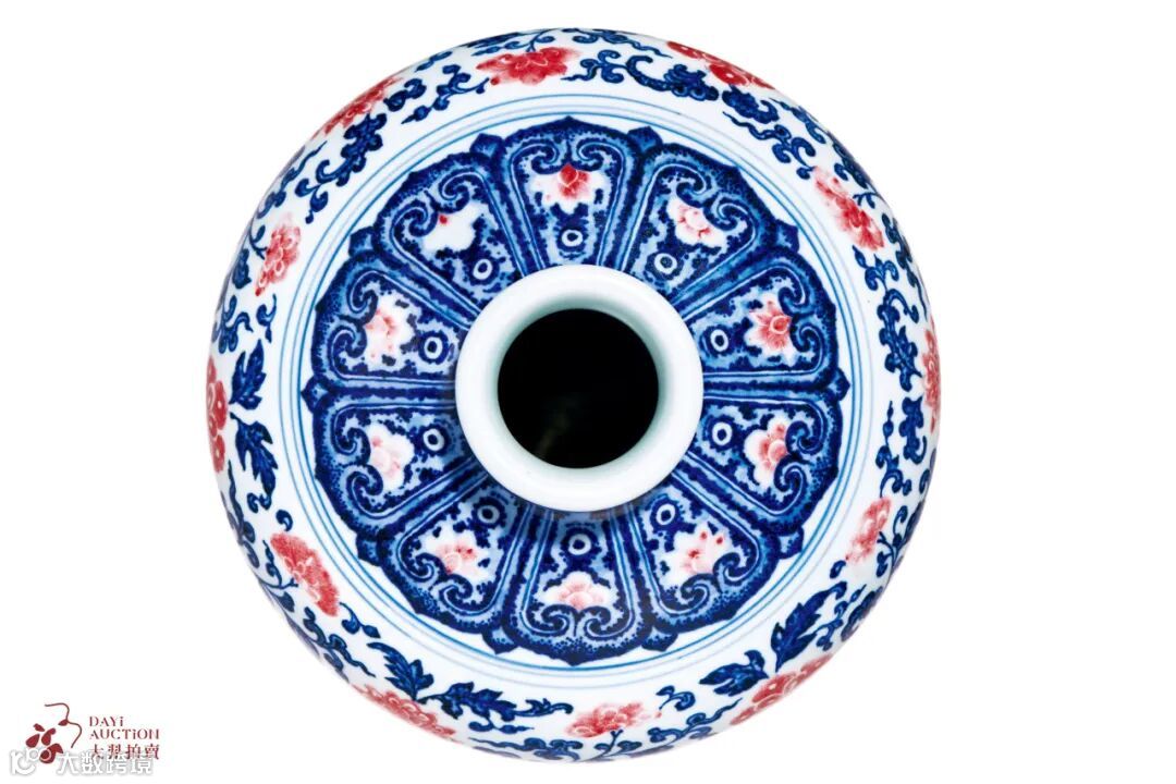 与本件拍品相同例证可查,北京故宫博物院、松竹堂藏有清乾隆青花釉里红缠枝莲纹梅瓶(《故宫博物院藏文物珍品大系——青花釉里红(下)》,商务印书馆(香港)有限公司,2000年,227页,图207),釉色、形制、款识与本件拍品一致。