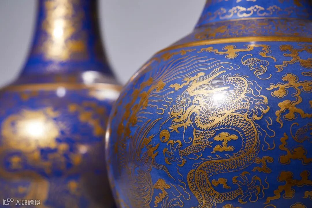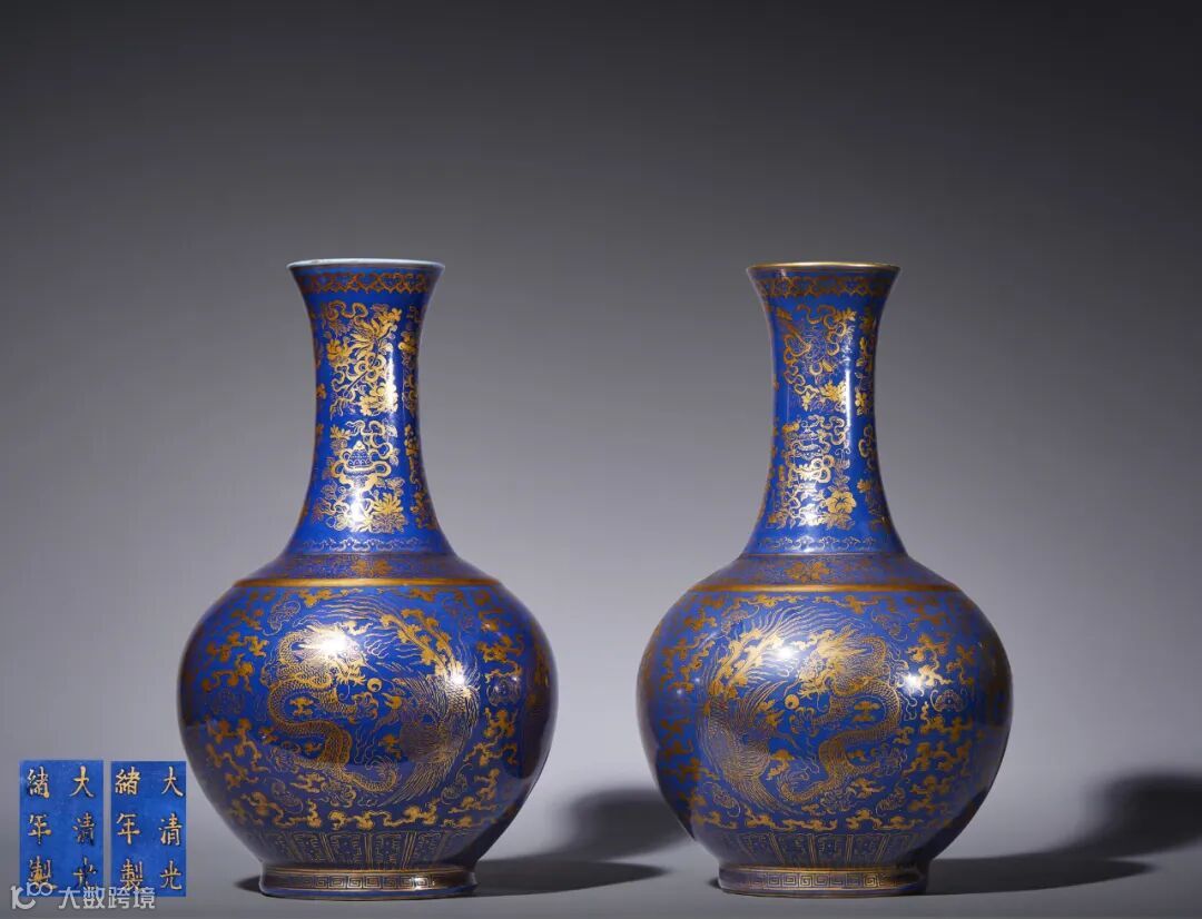瓶身通体施霁蓝釉为地,又加以金彩绘纹饰。颈部绘花卉博古图,肩部装饰一周宝相花托寿字纹,腹部饰主题纹饰,两瓶分别绘一龙、一凤翱翔于火焰祥云之间,金彩艳丽,尽显祥瑞吉庆,布局匀称,线条细腻流畅。底书“大清光绪年製”六字双行楷书款。此赏瓶造型规整,绘工精巧细致,纹饰华丽,金彩绚丽,霁蓝庄重静穆,交错相映,有富丽堂皇之感,保存完整,殊为难得,是为陈设佳器。据《清宫内务府造办处档案·记事录》载:"雍正八年十月奉命再将赏用瓷瓶烧造些来”,久而久之称为“赏瓶”。霁蓝描金玉堂春瓶为同治光绪两朝特有之品种,其中以光绪一朝最为精细.”