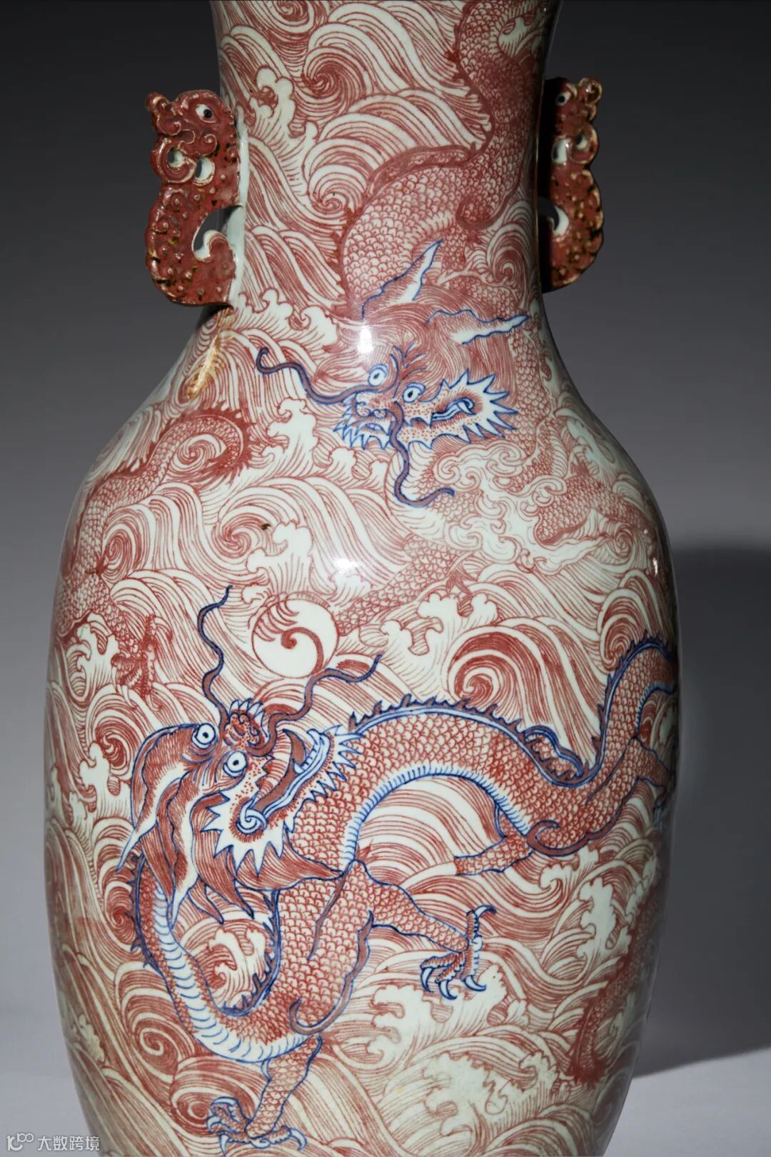 而本次“羿趣4”的拍品-青花釉里红海水龙纹双螭耳盘口瓶,青花釉里红,呈色分明,清晰。能烧出这样一只,可谓天助。