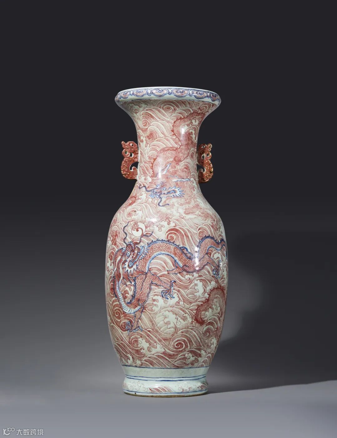 LOT21 清中期 青花釉里红海水龙纹双螭耳盘口瓶