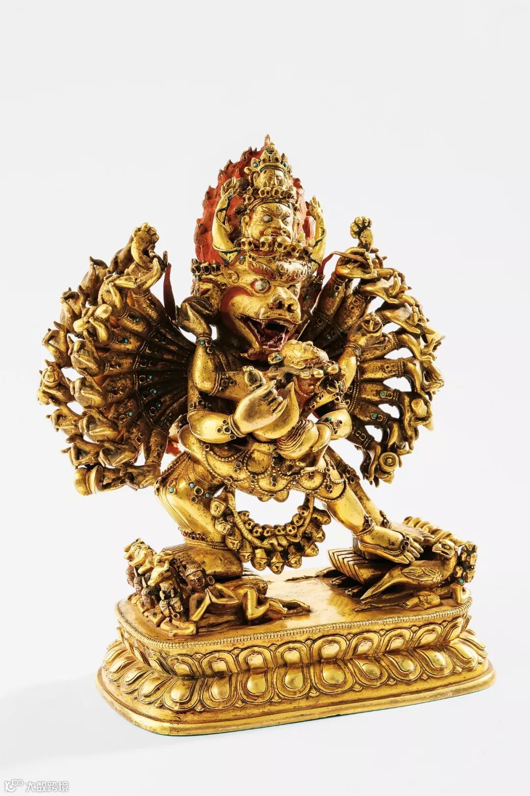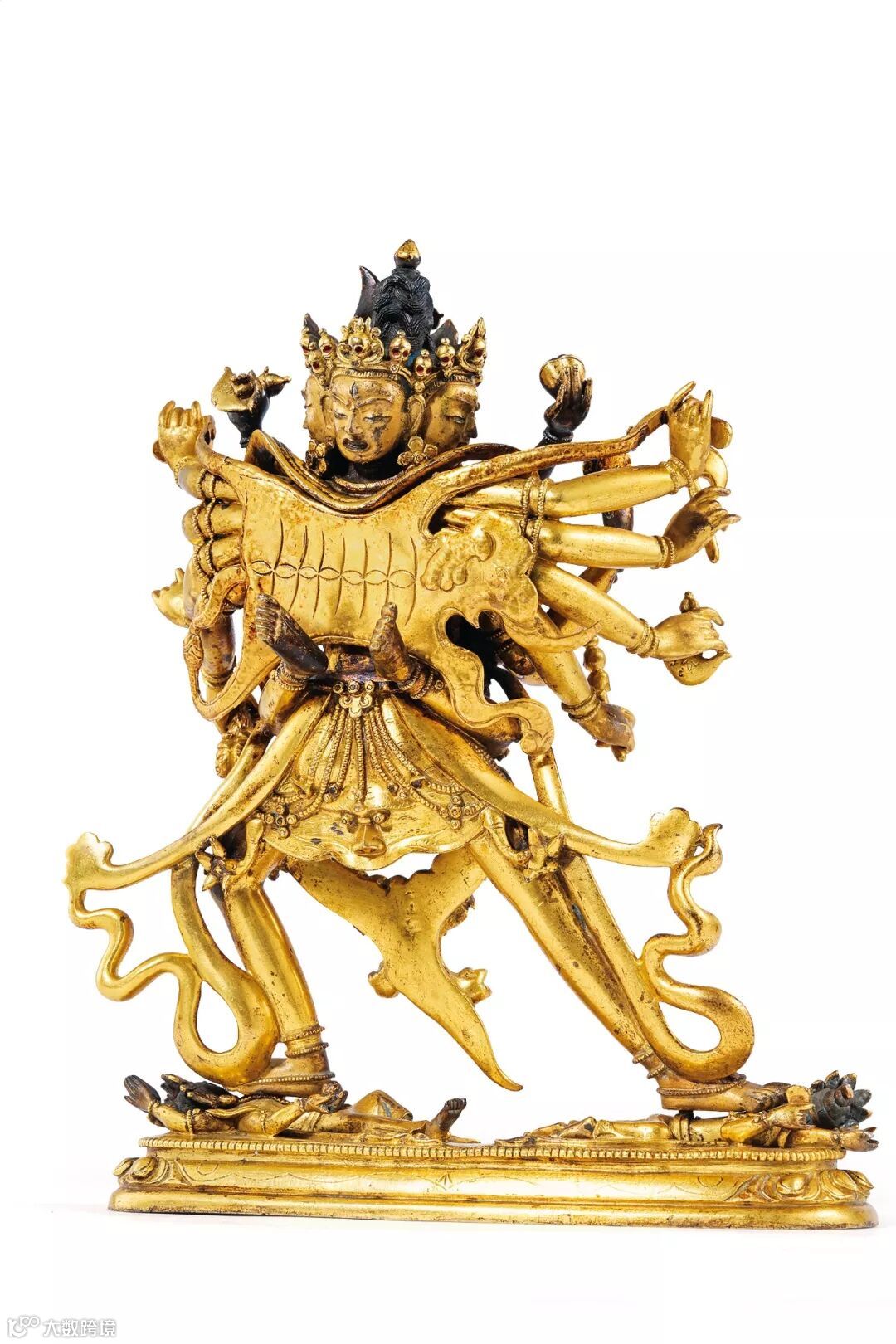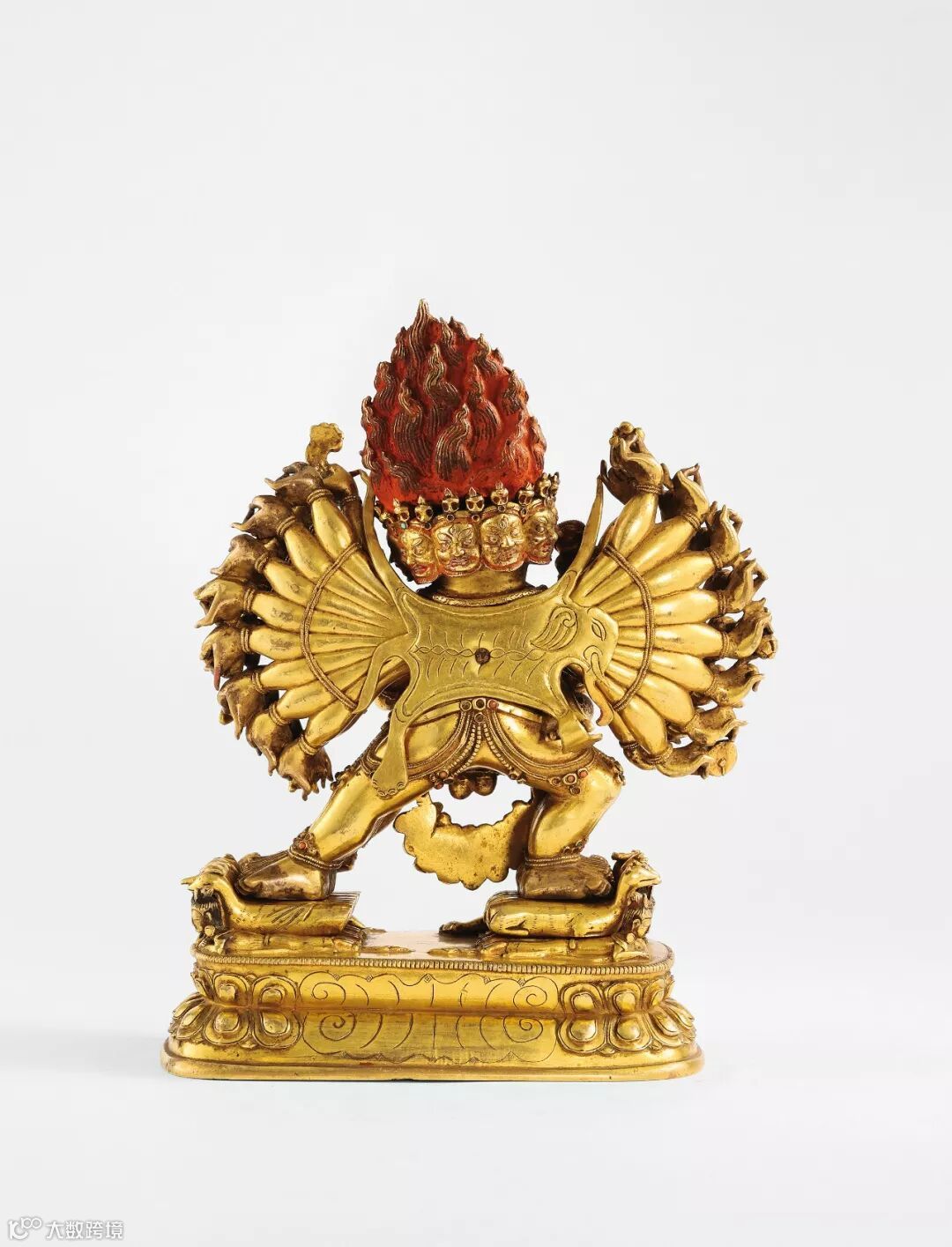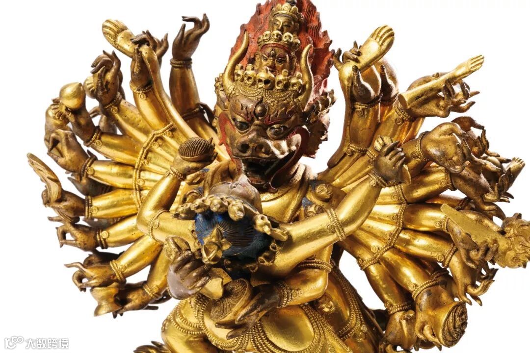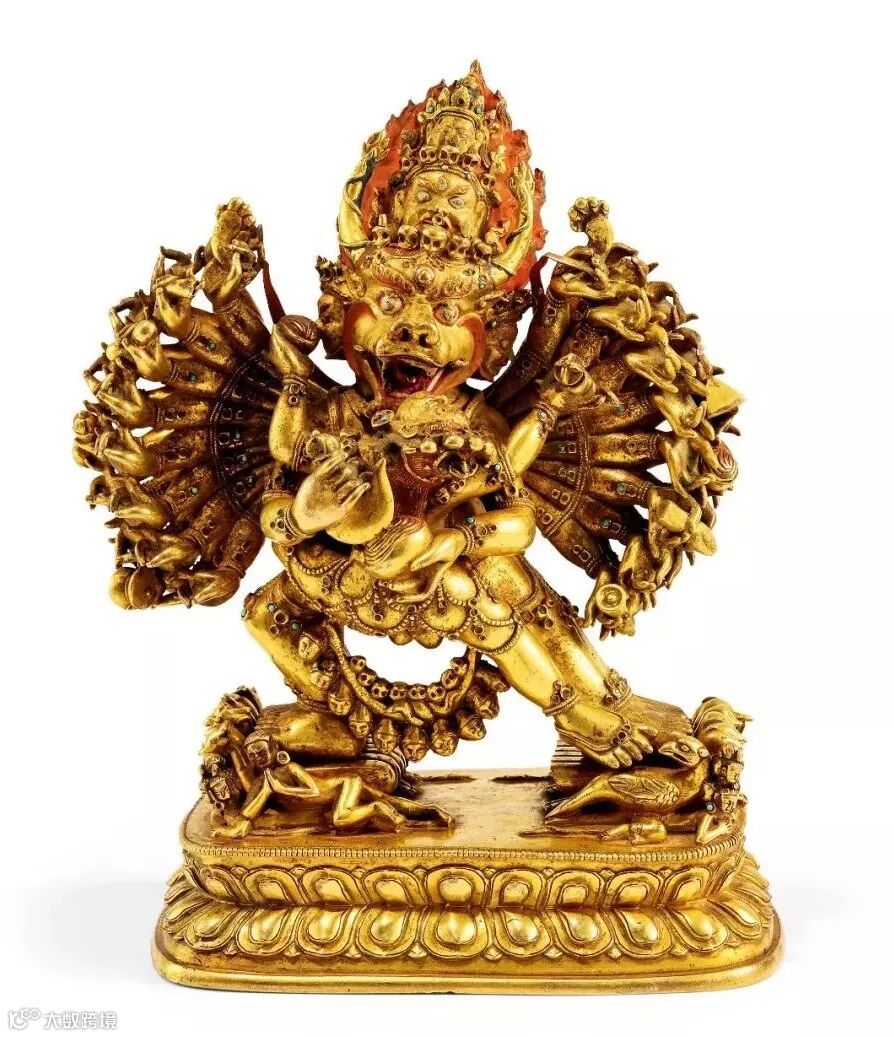 此尊的明妃是金刚起尸母,手持钺刀和骷髅碗,与大威德金刚相拥,立于莲花座上。金刚像主尊九头,正面为水牛头,面有三目,象征阎罗王;右三头象征愤怒、权势、安静三德能;左三头表示清净、死亡、愤怒;居中再上一头,呈愤怒像,头戴骷髅冠,为吃人夜叉,名参怖;顶层一头,为其本尊文殊菩萨形象。三十四臂分置于左右两侧,十六足各踏人、兽、禽等,象征十六空。右手持钺刀,左手持嘎巴拉碗,亦为忿怒相。单层莲座上缘连珠纹一周,排列规整,莲瓣扁平挺拔做工精细,全像鎏金灿然,制作精美,为乾隆时期藏传佛教造像佳作。