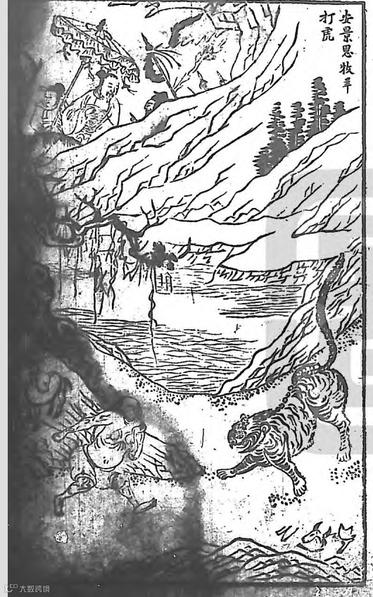 在《残唐五代史演义》的记载中,李存孝出场便是牧羊打虎,“于是令军士在对岸一齐叫喊,其人全然不动。原来风吹树响,涧水潺潺,其人熟睡,两耳无闻。正在感梦,忽有一羊撺过,惊醒其人,跳将起来,把眼一揉,见虎正在食羊,其人遂跳下漫汉石,脱了羊皮袄,伸手舒拳要来打虎。那虎见人欲来打他,便弃了羊,对面扑来。其人躲过,只扑了一个空,便倒在地,似一锦袋之状。其人赶上,用手挞住虎项,左胁下便打,右卸下便踢,那消数拳,其虎已死地下。”身为孤儿的安敬思,从小以给邓大户家放羊为生。一次放羊过程中,偶遇沙陀将军李克用出猎,后因安敬思徒手打死老虎,被李克用看中,遂认作义儿,改名为李存孝。